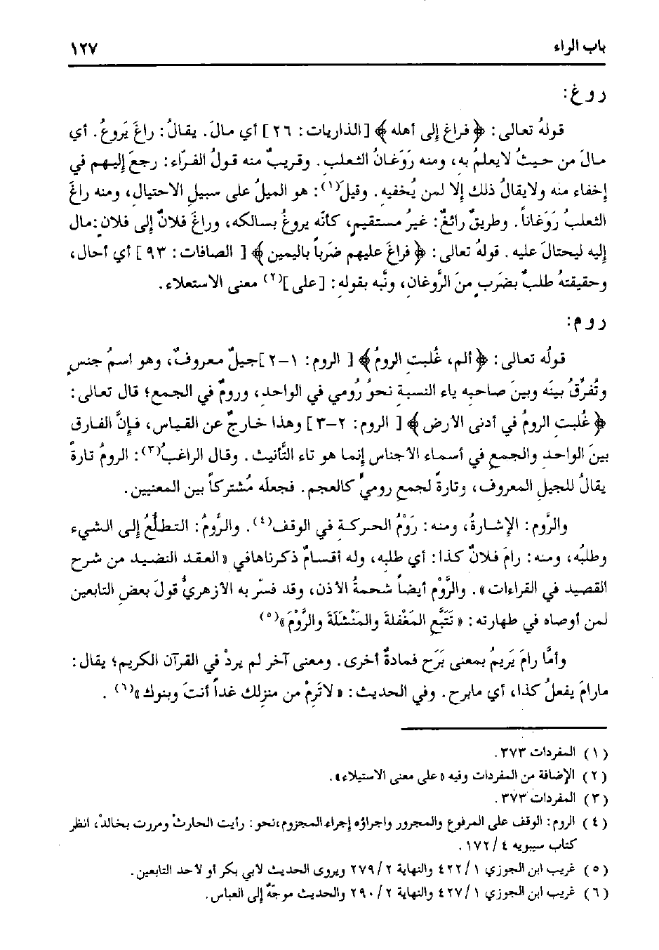قوله تعالى:} فراغ إلى أهله {[الذاريات: 26] أي مال. يقال: راغ يروع. أي مال من حيث لا يعلم به، ومنه روغان الثعلب. وقريب منه قول الفراء: رجع إليهم في إخفاء منه ولا يقال ذلك إلا لمن يخفيه. وقيل: هو الميل على سبيل الاحتيال، ومنه راغ الثعلب روغانًا. وطريق رائع: غير مستقيمٍ، كأنه يروغ بسالكه، وراغ فلان إلى فلانٍ: مال إليه ليحتال عليه. قوله تعالى:} فراغ عليهم ضربًا باليمين {[الصافات: 93] أي أحال، وحقيقته طلب بضربٍ من الروغان، ونبه بقوله: [على] معنى الاستعلاء.