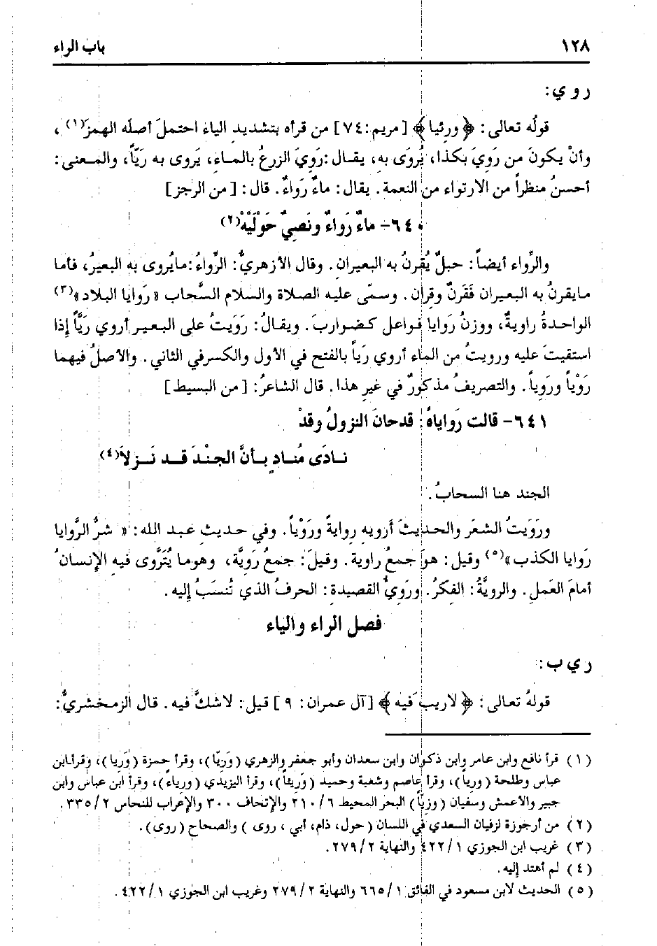 والرواء أيضًا: حبل يقرن به البعيران. وقال الأزهري: الرواء: ما يروي به البعير، فأما ما يقرن به البعيران فقرن وقران. وسمي عليه الصلاة والسلام السحاب "روايا البلاد" الواحدة راوية، ووزن روايا فواعل كضوارب. ويقال: رويت على البعير أروي ريًا إذا استقيت عليه ورويت من الماء أروي ريًا بالفتح في الأول والكسرفي الثاني. والأصل فيهما رويًا ورويًا. والتصريف مذكور في غير هذا. قال الشاعر: [من البسيط]