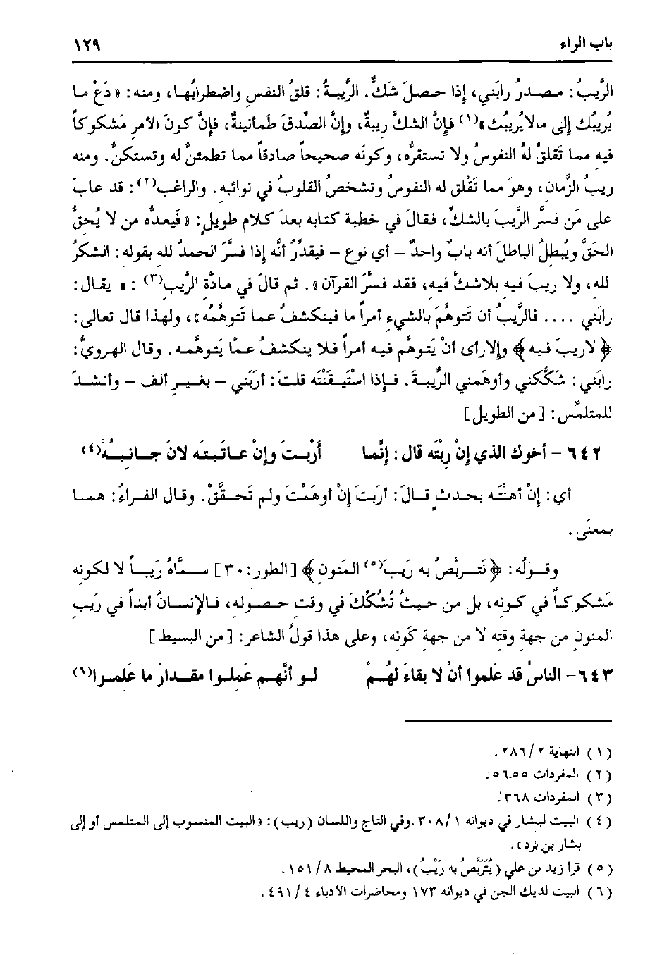 الريب: مصدر رابني، إذا حصل شك. الريبة: قلق النفس واضطرابها، ومنه: "دع ما يريبك إلى ما لا يريبك" فإن الشك ريبة، وإن الصدق طمأنينة، فإن كون الأمر مشكوكًا فيه مما تقلق له النفوس ولا تستقره، وكونه صحيحًا صادقًا مما تطمئن له وتستكن. ومنه ريب الزمان، وهو مما تقلق له النفوس وتشخص القلوب في نوائبه. والراغب: قد عاب على من فسر الريب بالشك، فقال في خطبة كتابه بعد كلام طويل: "فيعده من لا يحق الحق ويبطل الباطل أنه باب واحد - أي نوع - فيقدر أنه إذا فسر الحمد لله بقوله: الشكر لله، ولا ريب فيه بلا شك فيه، فقد فسر القرآن". ثم قال في مادة الريب: "يقال: رابني .... فالريب أن تتوهم بالشيء أمرًا ما فينكشف عما تتوهمه"، ولهذا قال تعالى:} لا ريب فيه {وإلا رأى أن يتوهم فيه أمرًا فلا ينكشف عما يتوهمه. وقال الهروي: رابني: شككني وأوهمني الريبة. فإذا استيقنته قلت: أربني - بغير ألف - وأنشد للمتلمس: [من الطويل]