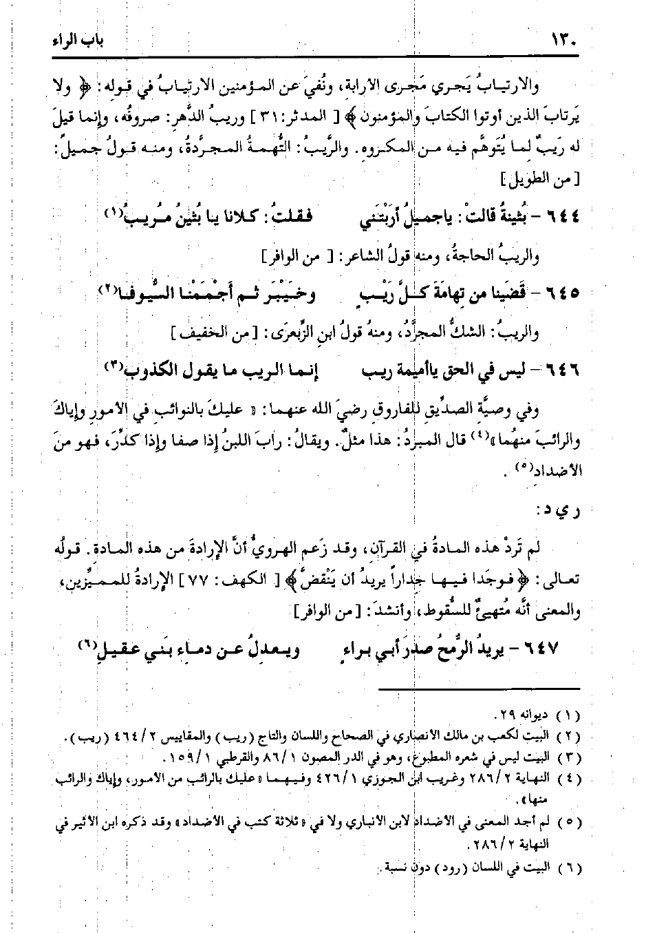 وفي وصية الصديق للفاروق رضي الله عنهما: "عليك بالنوائب في الأمور وإياك والرائب منهما" قال المبرد: هذا مثل. ويقال: راب اللبن إذا صفا وإذا كدر، فهو من الأضداد.