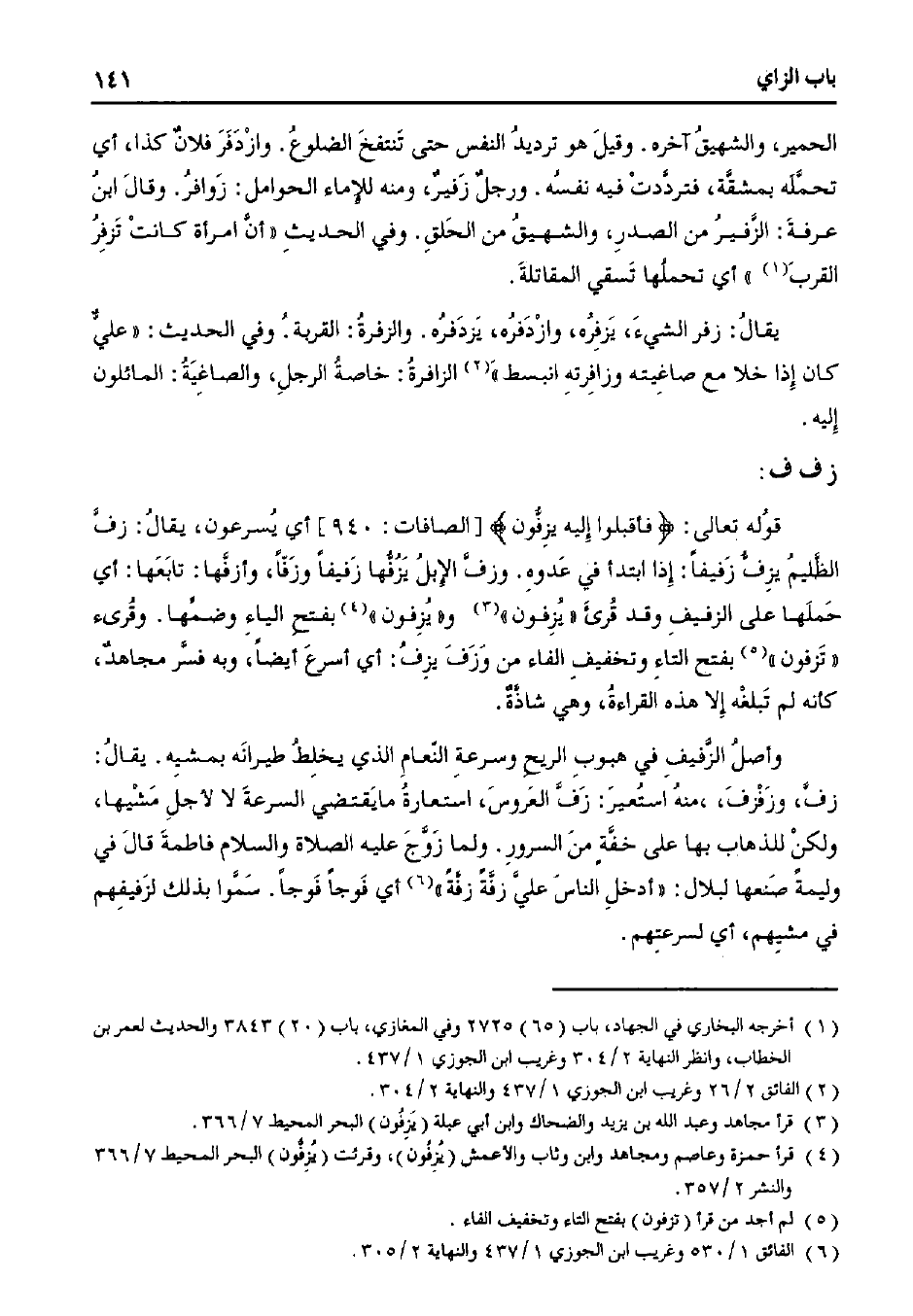 يقال: زفر الشيء، يزفره، وازدفره، يزدفره. والزفرة: القربة. وفي الحديث: "علي كان إذا خلا مع صاغيته وزافرته انبسط" الزافرة: خاصة الرجل، والصاغية: المائلون إليه.