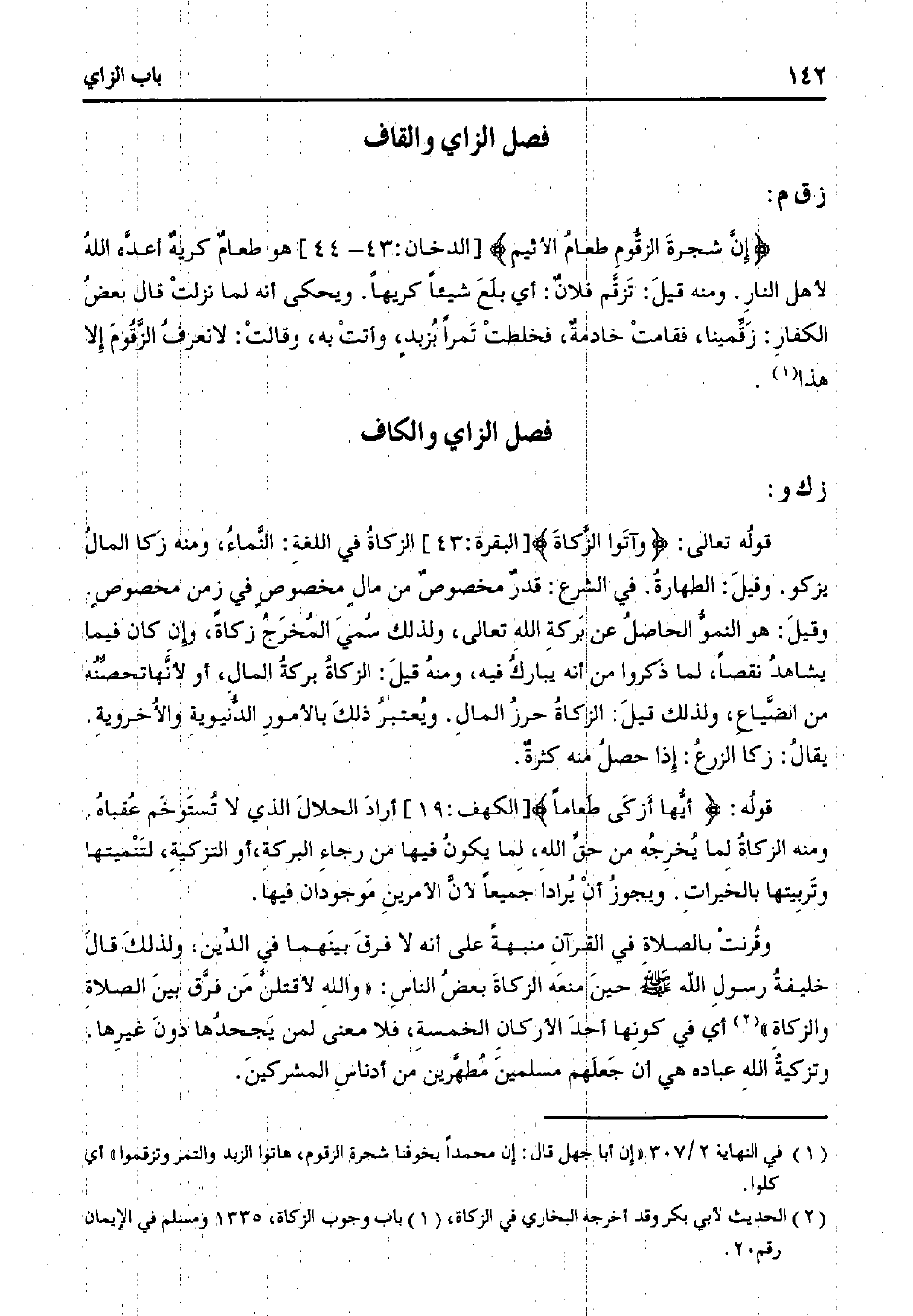 قوله تعالى:} وآتوا الزكاة {[البقرة: 43] الزكاة في اللغة: النماء، ومنه زكا المال يزكو. وقيل: الطهارة. في الشرع: قدر مخصوص من مالٍ مخصوصٍ في زمن مخصوصٍ. وقيل: هو النمو الحاصل عن بركة الله تعالى، ولذلك سمي المخرج زكاًة، وإن كان فيما يشاهد نقصًا، لما ذكروا من أنه يبارك فيه، ومنه قيل: الزكاة بركة المال، أو لأنها تحصنه من الضياع، ولذلك قيل: الزكاة حرز المال. ويعتبر ذلك بالأمور الدنيوية والأخروية. يقال: زكا الزرع: إذا حصل منه كثرة.