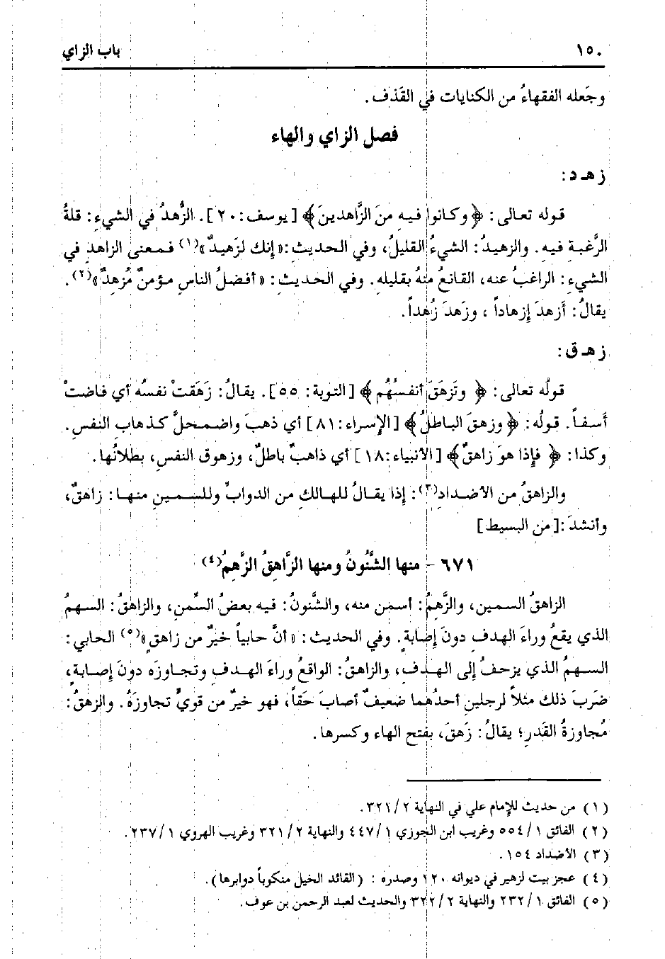 الزاهق السمين، والزهم: أسمن منه، والشنون: فيه بعض السمن، والزاهق: السهم الذي يقع وراء الهدف دون إصابةٍ. وفي الحديث: "أن حابيًا خير من زاهقٍ" الحابي: السهم الذي يزحف إلى الهدف، والزاهق: الواقع وراء الهدف وتجاوزه دون إصابة، ضرب ذلك مثلاً لرجلين أحدهما ضعيف أصاب حقًا، فهو خير من قوي تجاوزه. والزهق: مجاوزة القدر؛ يقال: زهق، بفتح الهاء وكسرها.