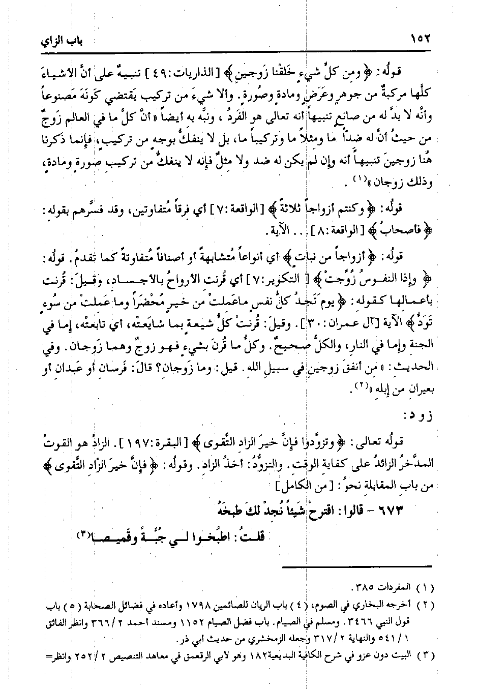 قوله تعالى:} وتزودوا فإن خير الزاد التقوى {[البقرة: 197]. الزاد هو القوت المدخر الزائد على كفاية الوقت. والتزود: أخذ الزاد. وقوله:} فإن خير الزاد التقوى {من باب المقابلة نحو: [من الكامل]
