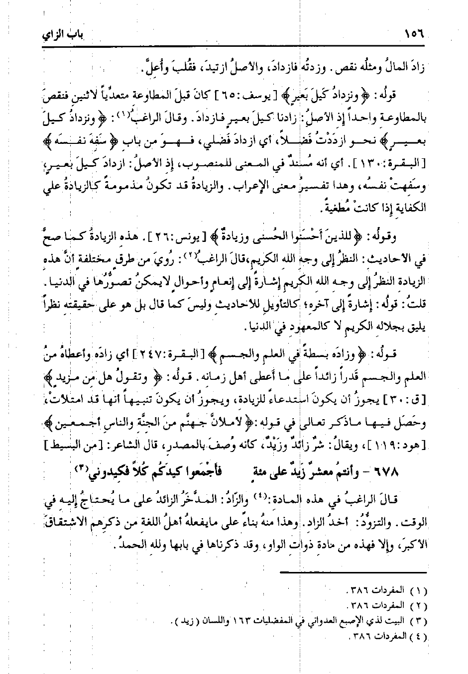 قوله: {وزاده بسطةً في العلم والجسم} [البقرة: 247] أي زاده وأعطاه من العلم والجسم قدرًا زائدًا على ما أعطى أهل زمانه. قوله: {وتقول هل من مزيد} [ق: 30] يجوز أن يكون استدعاءً للزيادة، ويجوز أن يكون تنبيهًا أنها قد امتلأت، وحصل فيها ما ذكر تعالى في قوله: {لأملأن جهنم من الجنة والناس أجمعين} [هود: 119]، ويقال: شرٌ زائدٌ وزيدٌ، كأنه وصف بالمصدر، قال الشاعر: [من البسيط]