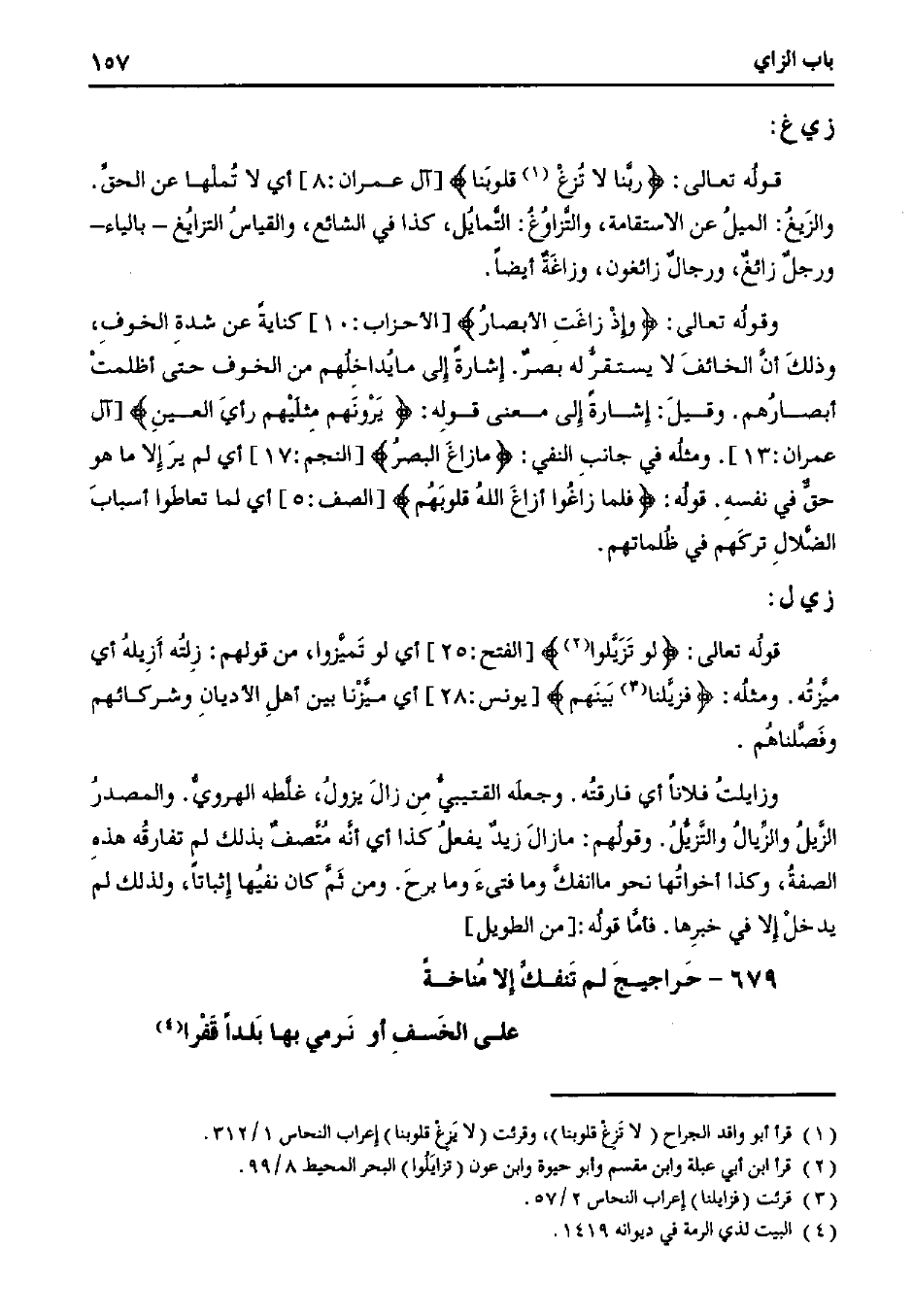 قوله تعالى: {ربنا لا تزغ قلوبنا} [آل عمران: 8] أي لا تملها عن الحق. والزيغ: الميل عن الاستقامة، والتزاوغ: التمايل، كذا في الشائع، والقياس التزايغ -بالياء -ورجلٌ زائغٌ، ورجالٌ زائغون، وزاغةٌ أيضًا.