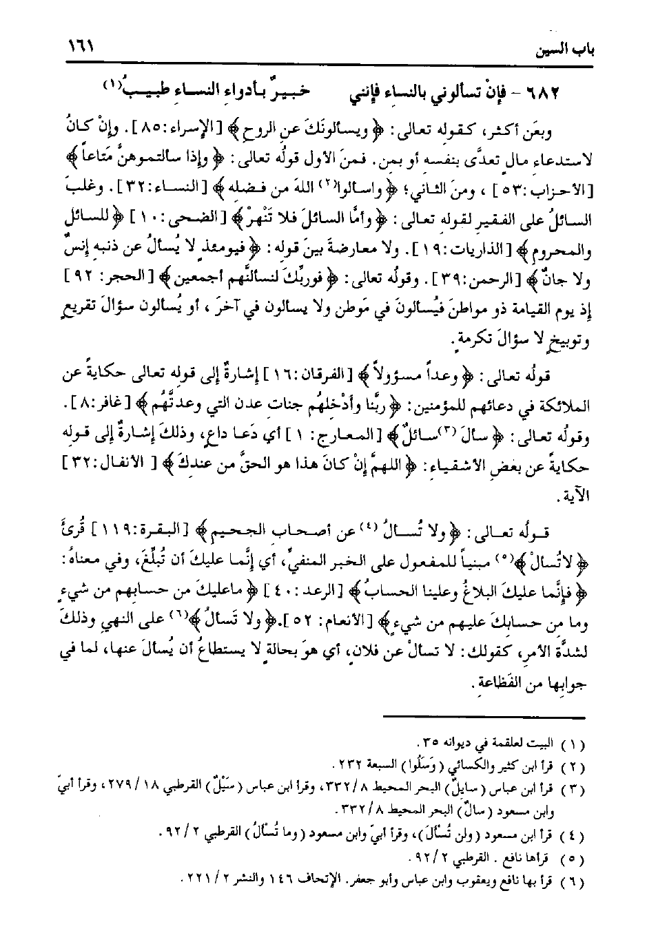 وبعن أكثر، كقوله تعالى: {ويسألونك عن الروح} [الإسراء: 85]. وإن كان لاستدعاء مال تعدى بنفسه أو بمن. فمن الأول قوله تعالى: {وإذا سألتموهن متاعًا} [الأحزاب: 53]، ومن الثاني؛ {واسألوا الله من فضله} [النساء: 32]. وغلب السائل على الفقير لقوله تعالى: {وأما السائل فلا تنهر} [الضحى: 10] {للسائل والمحروم} [الذاريات: 19]. ولا معارضة بين قوله: {فيومئذ لا يسأل عن ذنبه إنسٌ ولا جان} [الرحمن: 39]. وقوله تعالى: {فوربك لنسألنهم أجمعين} [الحجر: 92] إذ يوم القيامة ذو مواطن فيسألون في موطن ولا يسألون في آخر، أو يسألون سؤال تقريعٍ وتوبيخٍ لا سؤال تكرمةٍ.
