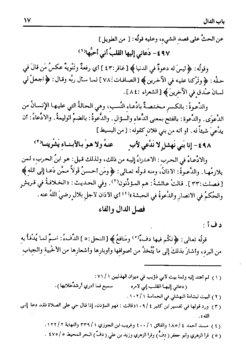 والإدعاء في الحرب: الاعتزاء إليه من ذلك، ولذلك قيل: هو ابن الحرب، لمن يلازمها. والدعوة: الأذان، ومنه قوله تعالى:} ومن أحسن قولاً ممن دعا إلى الله {[فصلت: 33]. قالت عائشة: هم المؤذنون. وفي الحديث: "الخلافة في قريشٍ والحكم في الأنصار والدعوة في الحبشة" أي الأذان لأجل بلالٍ رضي الله عنه.