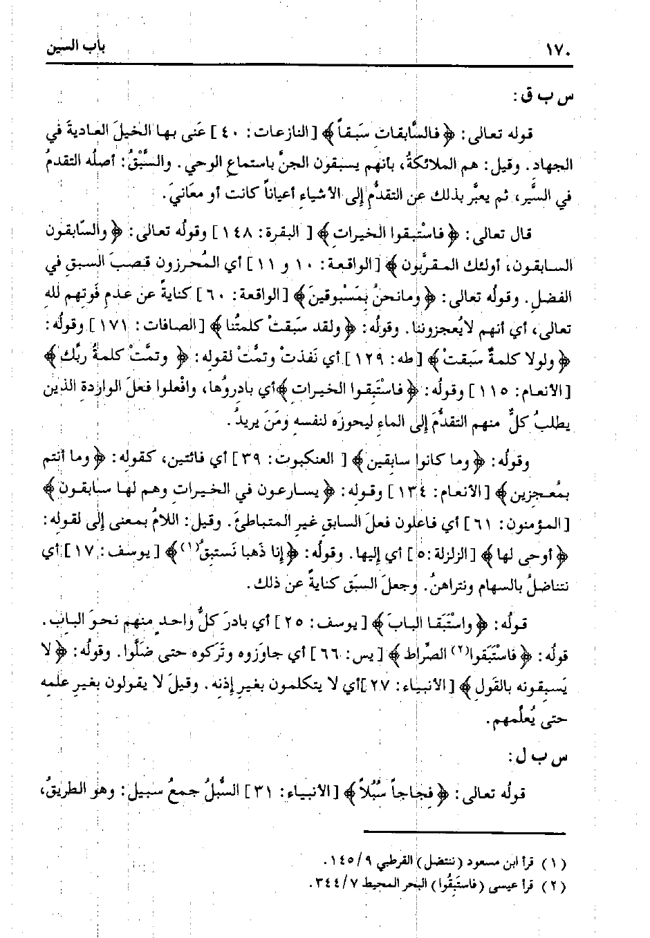 قوله: {واستبقا الباب} [يوسف: 25] أي بادر كل واحدٍ منهم نحو الباب. قوله: {فاستبقوا الصراط} [يس: 66] أي جاوزوه وتركوه حتى ضلوا. وقوله: {لا يسبقونه بالقول} [الأنبياء: 27] أي لا يتكلمون بغير إذنه. وقيل لا يقولون بغير علمه حتى يعلمهم.