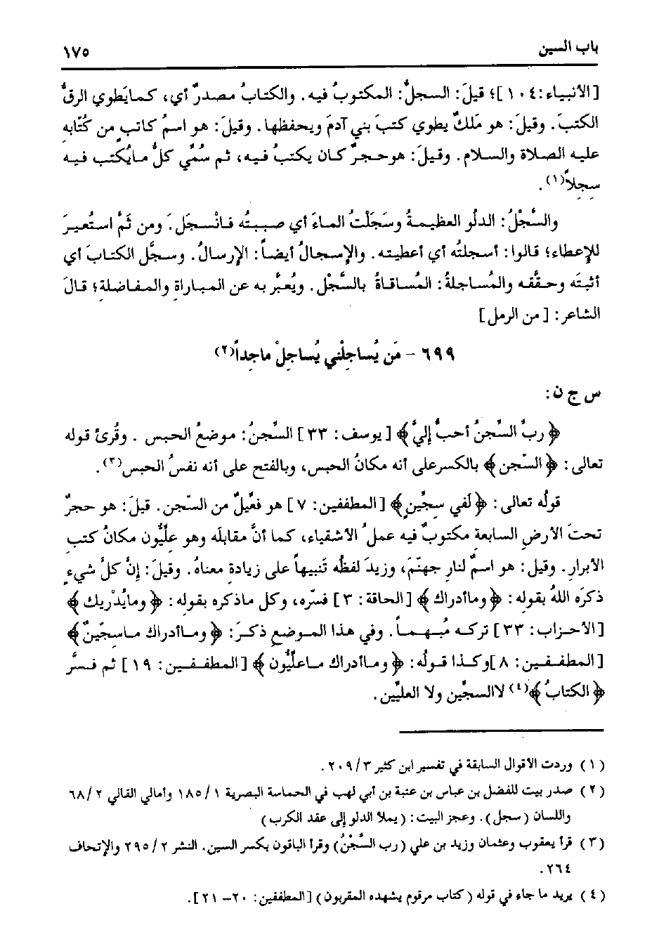 [الأنبياء: 104]؛ قيل: السجل: المكتوب فيه. والكتاب مصدرٌ أي، كما يطوي الرق الكتب. وقيل: هو ملكٌ يطوي كتب بني آدم ويحفظها. وقيل: هو اسم كاتبٍ من كتابه عليه الصلاة والسلام. وقيل: هو حجرٌ كان يكتب فيه، ثم سمي كل ما يكتب فيه سجلًا.