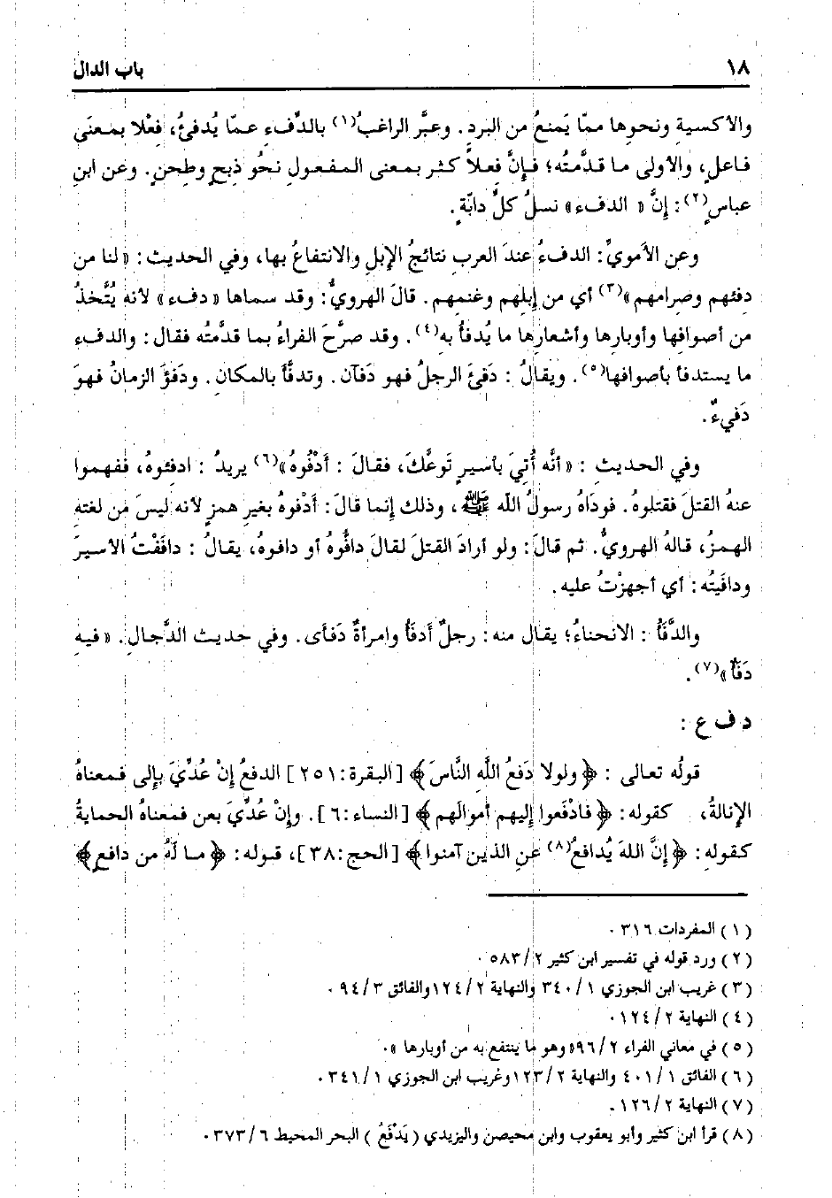 وعن الأموي: الدفء عند العرب نتائج الإبل والانتفاع بها، وفي الحديث: "لنا من دفئهم وصرامهم" أي من إبلهم وغنمهم. قال الهروي: وقد سماها "دفء" لأنه يتخذ من أصوافها وأوبارها وأشعارها ما يدفأ به. وقد صرح الفراء بما قدمته فقال: والدفء ما يستدفأ بأصوافها. ويقال: دفئ الرجل فهو دفىن. وتدفأ بالمكان. ودفؤ الزمان فهو دفيء.
