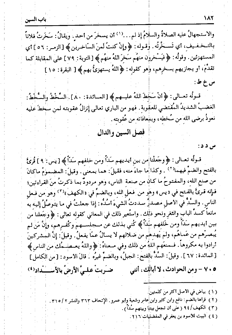 قوله تعالى: {وجعلنا من بين أيديهم سدًا ومن خلفهم سدًا} [يس: 9] قرئ بالفتح والضم فيهما. وكذا ما جاء منه، فقيل: هما بمعنى. وقيل: المضموم ما كان من صنع الله، والمفتوح ما كان من صنعة الناس، وهو مردودٌ بما ذكرت من القراءتين؛ فإنه قرئ بالفتح في «يس» وهو من فعل الله، وبالضم في «الكهف» وهو من فعل الناس. والسد في الأصل مصدر سددت الشيء أسده: إذا جعلت في ما يتوصل إليه به مانعًا كسد الباب والثغر ونحو ذلك. واستعير ذلك في المعاني كقوله تعالى: {وجعلنا من بين أيديهم سدًا ومن خلفهم سدًا} كني بذلك عن مجلسهم وكفرهم، وإن من لم يبصرهم من عماهم، ولم يهدهم من ضلالهم لا يسأل عما يفعل. وقيل: إن المشركين أرادوا به مكروهًا. فمنعهم الله من ذلك وفي معناه: {والله يعصمك من الناس} [المائدة: 67]. وقيل: السد بالفتح: الجبل، وبالضم غيره. قال الأسود: [من الكامل]