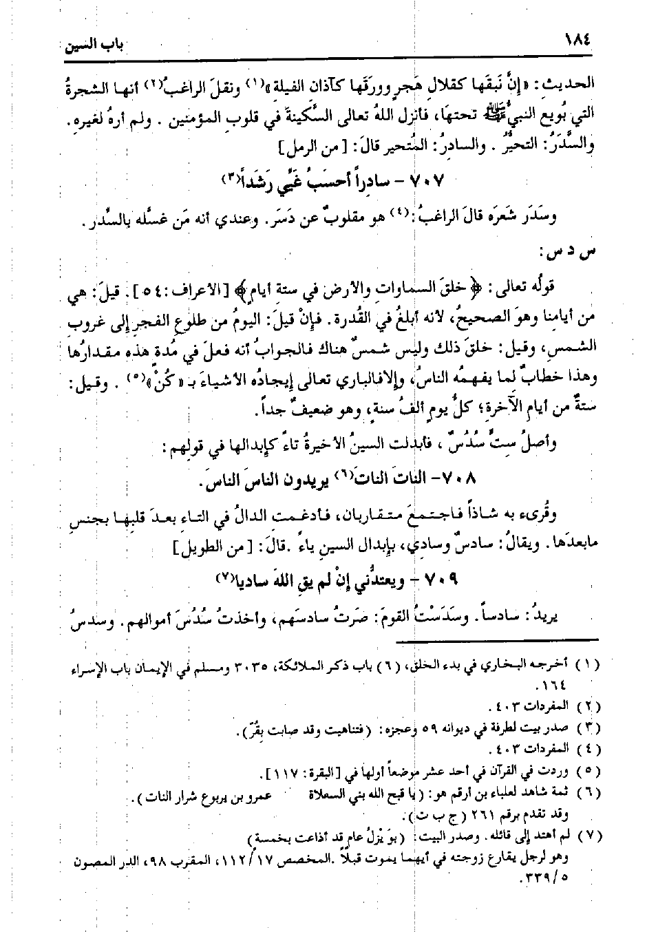 الحديث: «إن نبقها كقلال هجرٍ وورقها كآذان الفيلة» ونقل الراغب أنها الشجرة التي بويع النبي -صلى الله عليه وسلم -تحتها، فأنزل الله تعالى السكينة في قلوب المؤمنين. ولم أره لغيره. والسدر: التحير. والسادر: المتحير قال: [من الرمل]