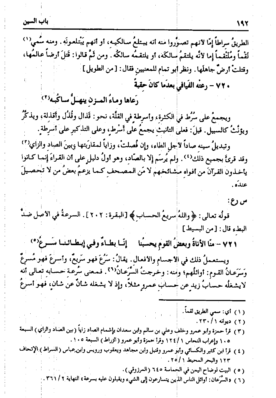 ويستعمل ذلك في الأجسام والأفعال. يقال: سرع فهو سريعٌ، وأسرع فهو مسرعٌ وسرعان القوم: أوائلهم؛ ومنه: وخرجت السرعان. فمعنى سرعة حسابه تعالى أنه لا يشغله حساب زيدٍ عن حساب عمروٍ مثلًا، وإذ لا يشغله شأنٌ عن شأنٍ، فهو أسرع