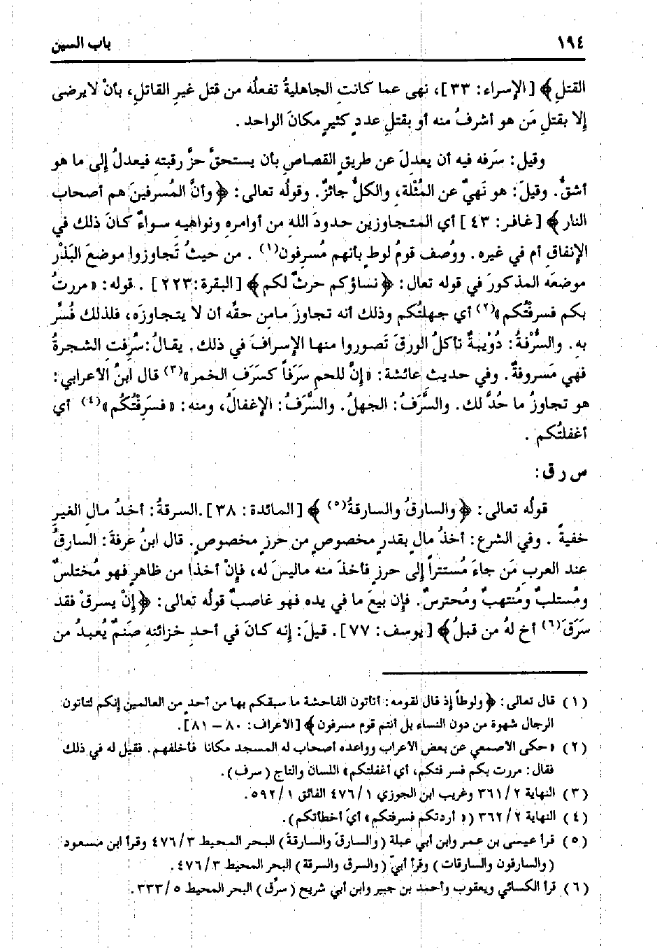 وقيل: سرفه فيه أن يعدل عن طريق القصاص بأن يستحق حز رقبته فيعدل إلى ما هو أشق. وقيل: هو نهيٌ عن المثلة، والكل جائزٌ. وقوله تعالى: {وأن المسرفين هم أصحاب النار} [غافر: 43] أي المتجاوزين حدود الله من أوامره ونواهيه سواءٌ كان ذلك في الإنفاق أم في غيره. ووصف قوم لوطٍ بأنهم مسرفون. من حيث تجاوزوا موضع البذر موضعه المذكور في قوله تعال: {نساؤكم حرثٌ لكم} [البقرة: 223]. قوله: «مررت بكم فسرفتكم» أي جهلتكم وذلك أنه تجاوز ما من حقه أن لا يتجاوزه، فلذلك فسر به. والسرفة: دويبةٌ تأكل الورق تصوروا منها الإسراف في ذلك. يقال: سرفت الشجرة فهي مسروفةٌ. وفي حديث عائشة: «إن للحم سرفًا كسرف الخمر» قال ابن الأعرابي: هو تجاوز ما حد لك. والسرف: الجهل. والسرف: الإغفال، ومنه: «فسرفتكم» أي أغفلتكم.