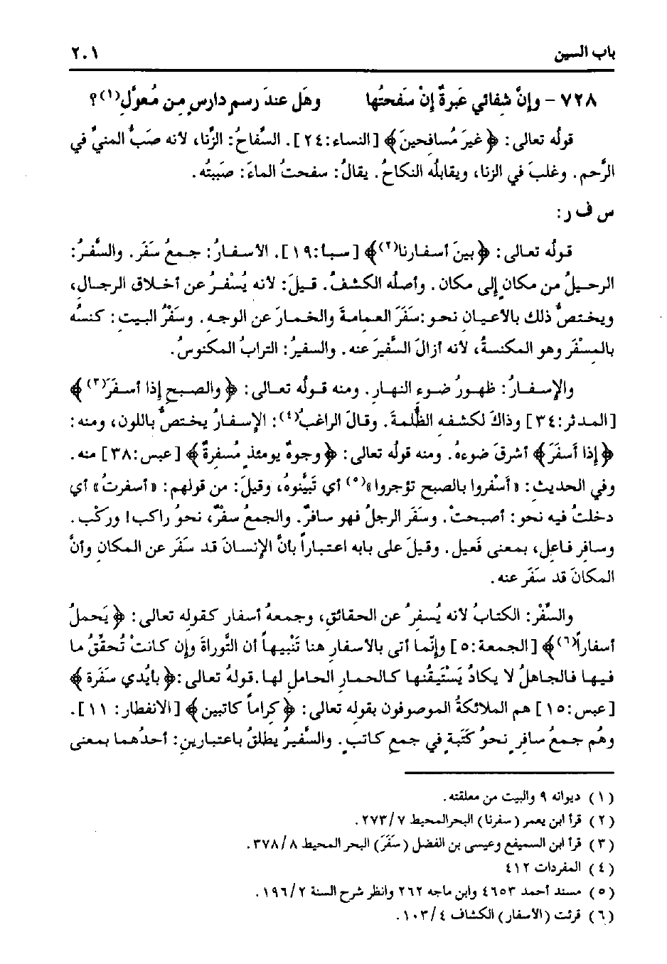 قوله تعالى: {بين أسفارنا} [سبأ: 19]. الأسفار: جمع سفر. والسفر: الرحيل من مكان إلى مكان. وأصله الكشف. قيل: لأنه يسفر عن أخلاق الرجال، ويختص ذلك بالأعيان نحو: سفر العمامة والخمار عن الوجه. وسفر البيت: كنسه بالمسفر وهو المكنسة، لأنه أزال السفير عنه. والسفير: التراب المكنوس.