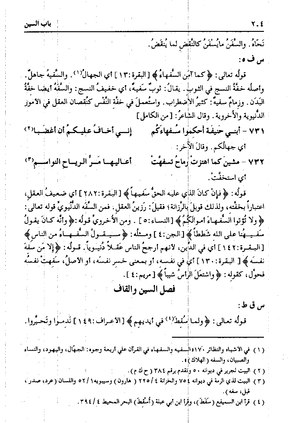 قوله: {فإن كان الذي عليه الحق سفيهًا} [البقرة: 282] أي ضعيف العقل، اعتبارًا بخفته، ولذلك قوبل بالرزانة؛ فقيل: رزين العقل. فمن السفه الدنيوي قوله تعالى: {ولا تؤتوا السفهاء أموالكم} [النساء: 5]. ومن الأخروي قوله: {وأنه كان يقول سفيهنا على الله شططًا} [الجن: 4] ومثله: {سيقول السفهاء من الناس} [البقرة: 142] أي في الدين، لأنهم أرجح الناس عقلًا دنيويًا. قوله: {إلا من سفه نفسه} [البقرة: 130] أي في نفسه، أو بمعنى خسر نفسه، أو الأصل، سفهت نفسه فحول، كقوله: {واشتعل الرأس شيبًا} [مريم: 4].