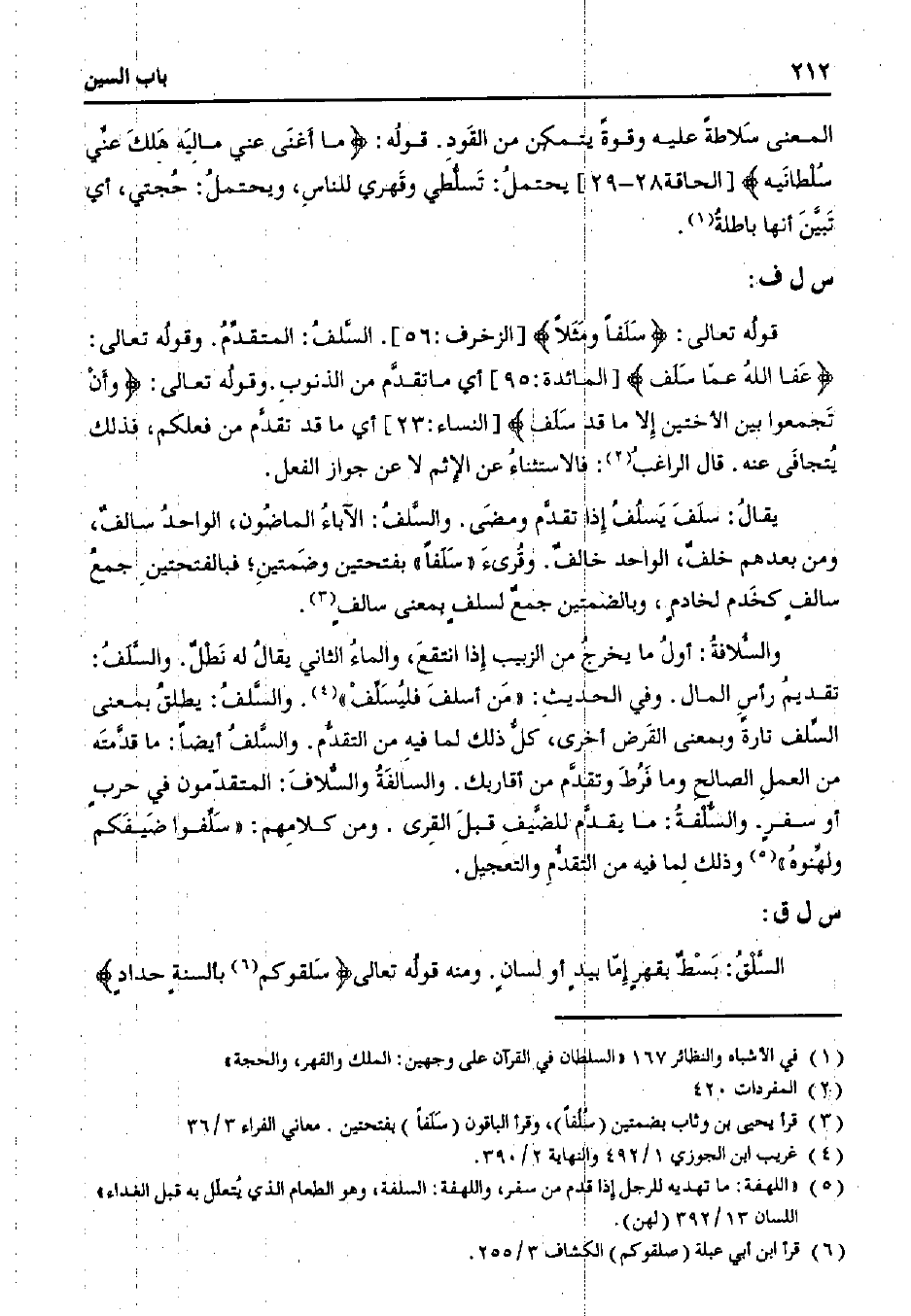 قوله تعالى: {سلفًا ومثلًا} [الزخرف: 56]. السلف: المتقدم. وقوله تعالى: {عفا الله عما سلف} [المائدة: 95] أي ما تقدم من الذنوب. وقوله تعالى: {وأن تجمعوا بين الأختين إلا ما قد سلف} [النساء: 23] أي ما قدم تقدم من فعلكم، فذلك يتجافى عنه. قال الراغب: فالاستثناء عن الإثم لا عن جواز الفعل.