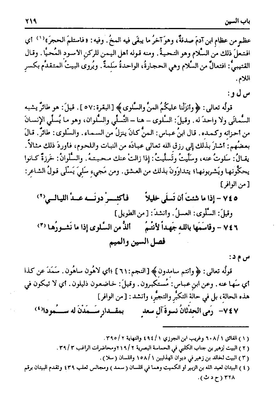 قوله تعالى: {وأنزلنا عليكم المن والسلوى} [البقرة: 57]. قيل: هو طائرٌ يشبه السماني ولا واحد له. وقيل: السلوى -هنا -التسلي والسلوان، وهو ما يسلي الإنسان من أحزانه وكمده. قال ابن عباس: المن كان ينزل من السماء. والسلوى: طائرٌ. قال بعضهم: أشار بذلك إلى رزق الله تعالى عباده من النبات واللحوم، فأورد ذلك مثالًا. يقال: سلوت عنه، وسليت وتسليت: إذا زالت عنك محبته. والسلوان: خرزةٌ كانو يحكونها ويشربونها؛ يتداوون بذلك من العشق. ومن مجيء سلي يسلى قول الشاعر: [من الوافر]