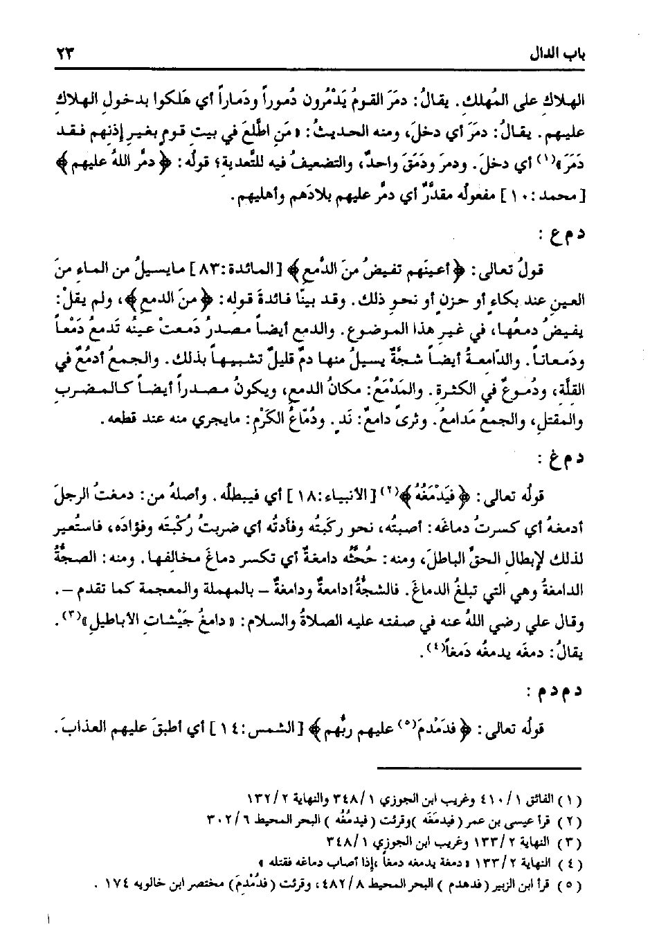 قوله تعالى:} فيدمغه {[الأنبياء: 18] أي فيبطله. وأصله من: دمغت الرجل أدمغه أي كسرت دماغه: أصبته، نحو ركبته وفأدته أي ضربت ركبته وفؤاده، فاستعير لذلك لإبطال الحق الباطل، ومنه: ححثه دامغة أي تكسر دماغ مخالفها. ومنه: الصجة الدامغة وهي التي تبلغ الدماغ. فالشجة! دامعة ودامغة - بالمهملة والمعجمة كما تقدم -. وقال علي رضي الله عنه في صفته عليه الصلاة والسلام: "دامغ جيشات الأباطيل". يقال: دمغه يدمغه دمغًا.