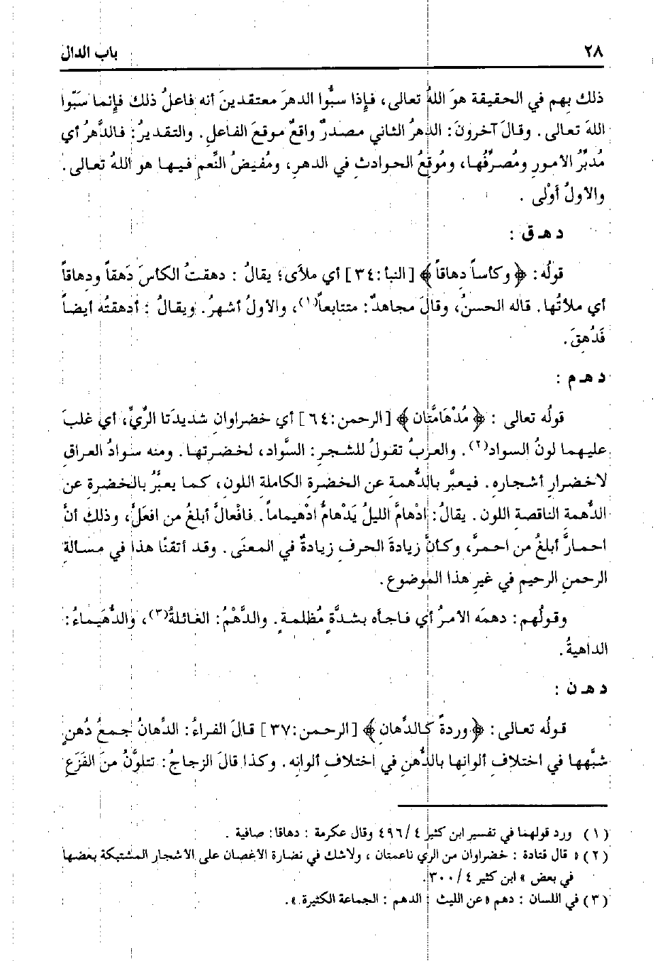 قوله تعالى:} وردًة كالدهان {[الرحمن: 37] قال الفراء: الدهان جمع دهنٍ شبهها في اختلاف ألوانها بالدهن في اختلاف ألوانه. وكذا قال الزجاج: تتلون من الفزع
