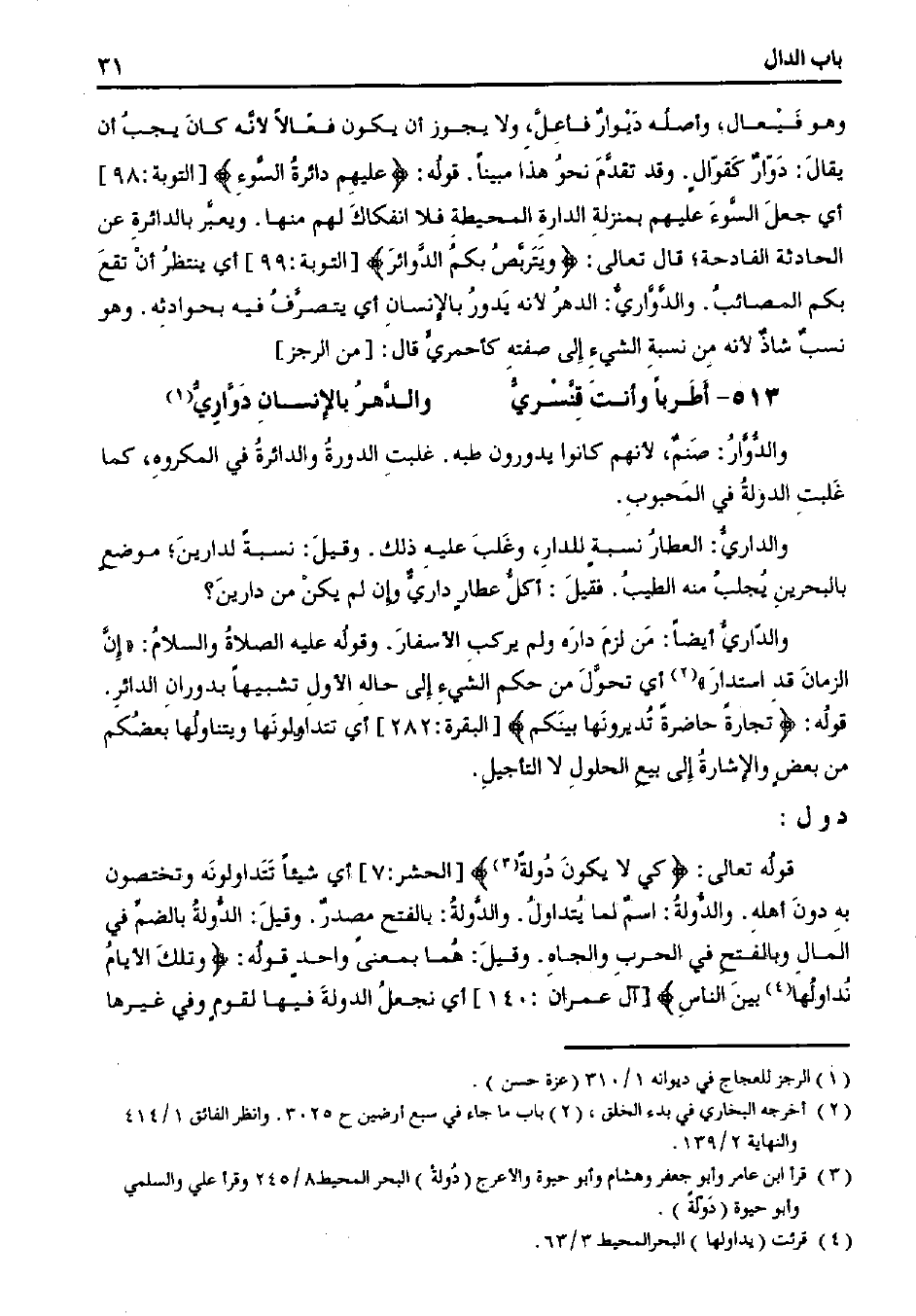 وهو فيعال، وأصله ديوار فاعل، ولا يجوز أن يكون فعالاً لأنه كان يجب أن يقال: دوار كقوالٍ. وقد تقدم نحو هذا مبينًا. قوله:} عليهم دائرة السوء {[التوبة: 98] أي جعل السوء عليهم بمنزلة الدارة المحيطة فلا انفكاك لهم منها. ويعبر بالدائرة عن الحادثة الفادحة؛ قال تعالى:} ويتربص بكم الدوائر {[التوبة: 99] أي ينتظر أن تقع بكم المصائب. والدواري: الدهر لأنه يدور بالإنسان أي يتصرف فيه بحوادثه. وهو نسب شاذ لأنه من نسبة الشيء إلى صفته كأحمري قال: [من الرجز]