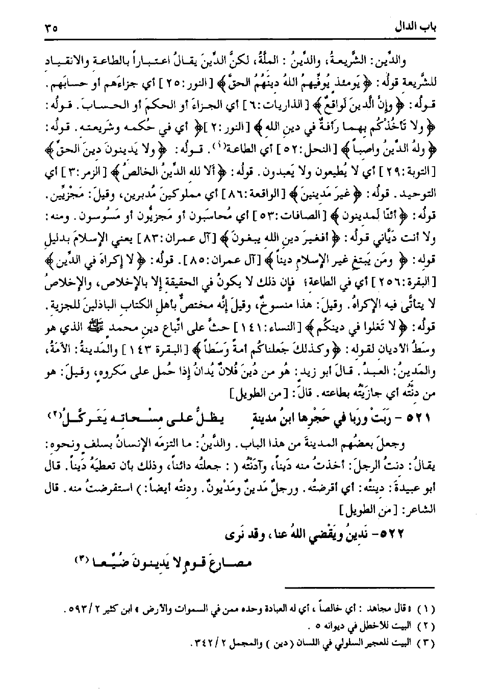 والدين: الشريعة، والدين: الملة، لكن الدين يقال اعتباراً بالطاعة والانقياد للشريعة قوله:} يومئذٍ يوفيهم الله دينهم الحق {[النور: 25] أي جزاءهم أو حسابهم. قوله:} وإن الدين لواقع {[الذاريات: 6] أي الجزاء أو الحكم أو الحساب. قوله:} ولا تأخذكم بهما رأفة في دين الله {[النور: 2]} أي في حكمه وشريعته. قوله: {وله الدين واصباً {[النحل: 52] أي الطاعة. قوله:} ولا يدينون دين الحق {[التوبة: 29] أي لا يطيعون ولا يعبدون. قوله:} ألا لله الدين الخالص {[الزمر: 3] أي التوحيد. قوله:} غير مدينين {[الواقعة: 86] أي مملوكين مدبرين، وقيل: مجزيين. قوله:} أئنا لمدينون {[الصافات: 53] أي محاسبون أو مجزيون أو مسوسون. ومنه: ولا أنت دياني قوله:} أفغير دين الله يبغون {[آل عمران: 83] يعني الإسلام بدليل قوله:} ومن يبتغ غير الإسلام ديناً {[آل عمران: 85]. قوله:} لا إكراه في الدين {[البقرة: 256] أي في الطاعة؛ فإن ذلك لا يكون في الحقيقة إلا بالإخلاص، والإخلاص لا يتأتي فيه الإكراه. وقيل: هذا منسوخ، وقيل إنه مختص بأهل الكتاب الباذلين للجزية. قوله:} لا تغلوا في دينكم {[النساء: 141] حث على إتباع دين محمد صلى الله عليه وسلم الذي هو وسط الأديان لقوله:} وكذلك جعلناكم أمة وسطاً {[البقرة: 143] والمدينة: الأمة، والمدين: العبد. قال أبو زيدٍ: هو من دين فلان يدان إذا حمل على مكروهٍ، وقيل: هو من دنته أي جازيته بطاعته. قال: [من الطويل]