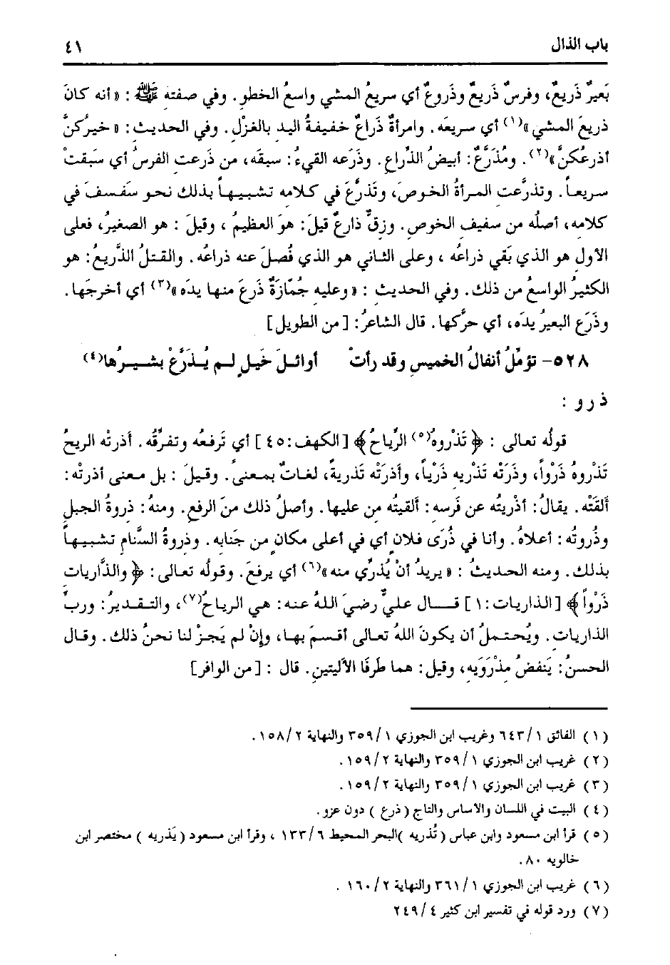 بعير ذريع، وفرس ذريع وذروع أي سريع المشي واسع الخطو. وفي صفته صلى الله عليه وسلم: "أنه كان ذريع المشي" أي سريعه. وامرأة ذراع خفيفة اليد بالغزل. وفي الحديث: "خيركن أذرعكن". ومذرع: أبيض الذراع. وذرعه القيء: سبقه، من ذرعت الفرس أي سبقت سريعًا. وتذرعت المرأة الخوص، وتذرع في كلامه تشبيهًا بذلك نحو سفسف في كلامه، أصله من سفيف الخوص. وزق ذارع قيل: هو العظيم، وقيل: هو الصغير، فعلى الأول هو الذي بقي ذراعه، وعلى الثاني هو الذي فصل عنه ذراعه. والقتل الذريع: هو الكثير الواسع من ذلك. وفي الحديث: "وعليه جمازة ذرع منها يده" أي أخرجها. وذرع البعير يده، أي حركها. قال الشاعر: [من الطويل]