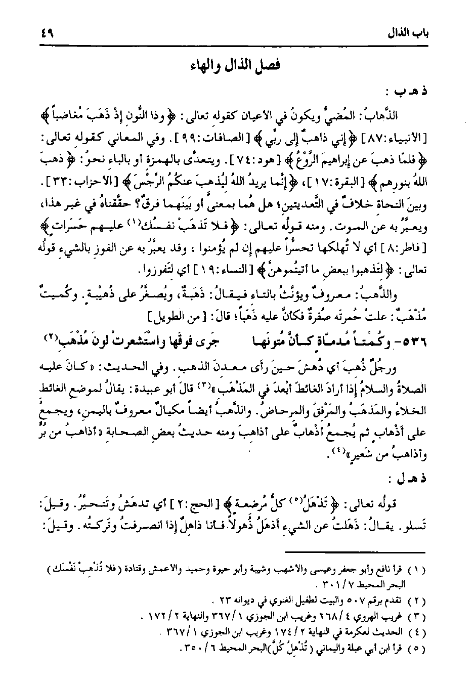 الذهاب: المضي ويكون في الأعيان كقوله تعالى:} وذا النون إذ ذهب مغاضبًا {[الأنبياء: 87]} إني ذاهب إلى ربي {[الصافات: 99]. وفي المعاني كقوله تعالى:} فلما ذهب عن إبراهيم الروع {[هود: 74]. ويتعدى بالهمزة أو بالباء نحو:} ذهب الله بنورهم {[البقرة: 17]،} إنما يريد الله ليذهب عنكم الرجس {[الأحزاب: 33]. وبين النحاة خلاف في التعديتين؛ هل هما بمعنى أو بينهما فرق؟ حققناه في غير هذا، ويعبر به عن الموت. ومنه قوله تعالى:} فلا تذهب نفسك عليهم حسراتٍ {[فاطر: 8] أي لا تهلكها تحسرًا عليهم إن لم يؤمنوا، وقد يعبر به عن الفوز بالشيء قوله تعالى:} لتذهبوا ببعض ما أتيتموهن {[النساء: 19] أي لتفوزوا.