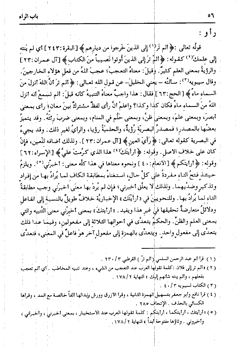 قوله تعالى: {ألم تر إلى الذين خرجوا من ديارهم {[البقرة: 243] أي لم ينته إلى علمك كقوله:} ألم تر إلى الذين أوتوا نصيبًا من الكتاب {[آل عمران: 23] والرؤية بمعنى العلم كثير. وقيل: معناه التعجب؛ عجب الله من فعل هؤلاء الخارجين. وقال سيبويه: سألته - يعني الخليل - عن قول الله تعالى:} الم تر أن الله أنزل من السماء ماًء {[الحج: 63] فقال: هذا واجب معناه التنبيه كأنه قيل: ألم تسمع أنه أنزل الله من السماء ماًء فكان كذا وكذا؟ واعلم أن رأى لفظ مشترك بين معانٍ؛ رأى بمعنى أبصر، وبمعنى علم، وبمعنى ظن، وبمعنى حلم في المنام، وبمعنى ضرب رئته. وقد يتميز بعضها بالمصدر؛ فمصدر البصرية رؤية، والحلمية رؤيا، والرأي لغير ذلك. وقد يجيء في البصرية كقوله تعالى:} رأي العين {[آل عمران: 23]. ولذلك أضافه للعين، فإن كان على خلاف الأصل. وقوله:} أرأيتك هذا الذي كرمت علي {[الإسراء: 62] وقوله:} أرأيتكم {[الأنعام: 40] ونحوه معناها في هذا كله معنى: أخبرني. ويلزم حينئذٍ فتح التاء مفردًة على كل حالٍ، استغناًء بمطابقة الكاف لما يراد بها من إفراد وتذكيرٍ وضديهما. ولذلك لا يعلق أخبرني؛ فإن لم يرد بها معنى أخبرني وجب مطابقة التاء لما يراد بها. وللنحويين في "أرأيتك" الإخبارية خلاف طويل بالنسبة إلى الفاعل ودلائل متعارضة تحقيقها في غير هذا ويفيد. "أرأيتك" بمعنى أخبرني معنى التنبيه والتي بمعنى العلم والظن. والحكم يتعدى في أحوالها الثلاثة إلى مفعولين، وفيما عدا ذلك يتعدى إلى مفعولٍ واحدٍ. ويتعدى بالهمزة إلى مفعولٍ آخر هو فاعل في المعنى، فتعدى