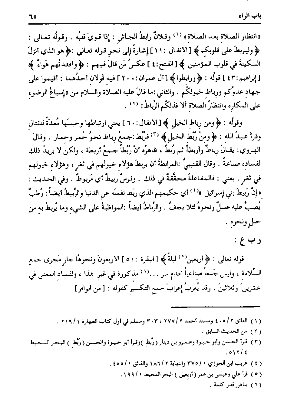 "انتظار الصلاة بعد الصلاة" وفلان رابط الجاش: إذا قوي قلبه. وقوله تعالى:} وليربط على قلوبكم {[الأنفال: 11] إشارة إلى نحو قوله تعالى:} هو الذي أنزل السكينة في قلوب المؤمنين {[الفتح: 4] عكس من قال فيهم:} وأفئدتهم هواء {[إبراهيم: 43] قوله:} ورابطوا {[آل عمران: 200] فيه قولان أحدهما: أقيموا على جهاد عدوكم ورباط خيولكم. والثاني: ما قال عليه الصلاة والسلام من "إسباغ الوضوء على المكاره وانتظار الصلاة ألا فذلكم الرباط".
