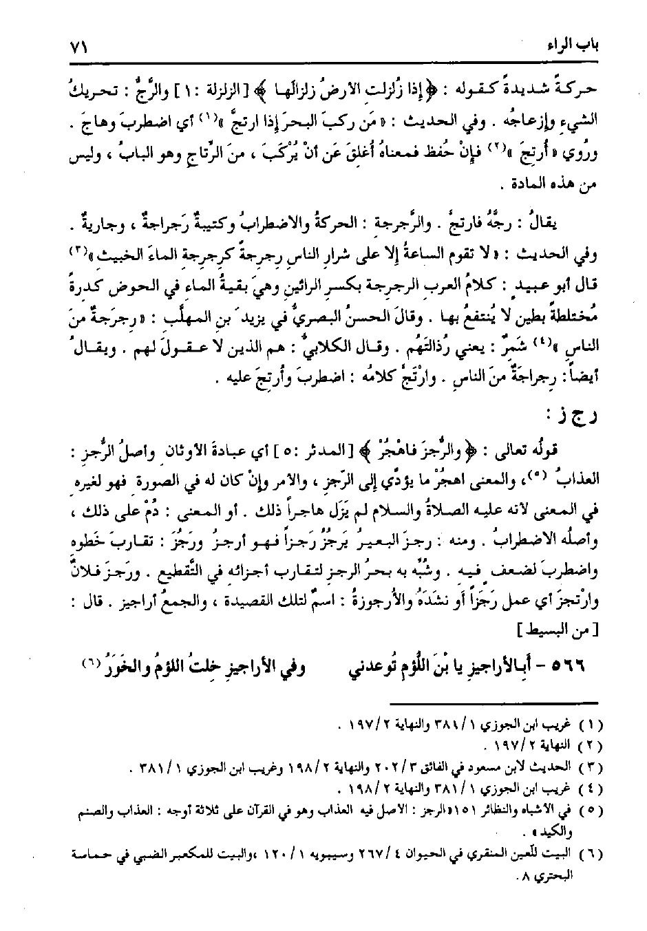 قوله تعالى:} والرجز فاهجر {[المدثر: 5] أي عبادة الأوثان وأصل الرجز: العذاب، والمعنى اهجر ما يؤدي إلى الرجز، والأمر وإن كان له في الصورة فهو لغيره في المعنى لأنه عليه الصلاة والسلام لم يزل هاجرًا ذلك. أو المعنى: دم على ذلك، وأصله الاضطراب. ومنه: رجز البعير يرجز رجزًا فهو أرجز ورجز: تقارب خطوه واضطرب لضعفٍ فيه. وشبه به بحر الرجز لتقارب أجزائه في التقطيع. ورجز فلان وارتجز أي عمل رجزًا أو نشده والأرجوزة: اسم لتلك القصيدة، والجمع أراجيز. قال: [من البسيط]