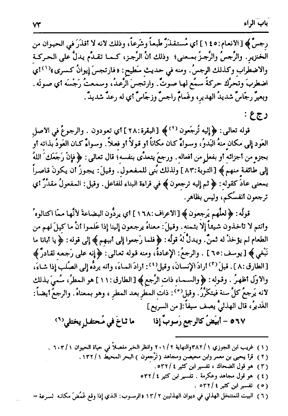قوله:} لعلهم يرجعون {[الأعراف: 168] أي يردون البضاعة لأنها مما اكتالوه وأنتم لا تأخذون شيئًا إلا بثمنه. وقيل: معناه يرجعون إلينا إذا علموا أن ما كيل لهم من الطعام لم يؤخذ له ثمن. ويدل له قوله:} فلما رجعوا إلى أبيهم {إلى قوله:} يا أبانا ما نبغي {[يوسف: 65]. والرجع: الإعادة، ومنه قوله تعالى:} إنه على رجعه لقادر {[الطارق: 8]. قيل أراد الإنسان، وقيل: أراد الماء، وأنه يرده إلى الصلب إذا شاء، والأول أظهر. وقوله:} والسماء ذات الرجع {[الطارق: 11] هو المطر، سمي بذلك لأنه يرجع كل سنة فيتكرر. وقيل: ذات المطر بعد المطر، وهو بمعناه. والرجع أيضًا: الغدير، قال الهذلي يصف سيفًا: [من السريع]