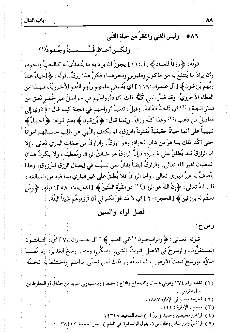 قوله:} رزقًا للعباد {[ق: 11] يجوز أن يراد به ما يتغذى به كالحب ونحوه، وأن يراد ما ينتفع به من مأكولٍ وملبوسٍ ونحوهما، فكل هذا رزق. قوله:} أحياء عند ربهم يرزقون {[آل عمران: 169] أي يفيض عليهم ربهم النعم الأخروية، فهذا من العطاء الأخروي. وقد فسر النبي صلى الله عليه وسلم ذلك بأن "أرواحهم في حواصل طيرٍ خضرٍ تعلق من ثمار الجنة" أي تأخذ العلقة. وقيل: تنعيم أرواحهم في الجنة كما قال: "تأوي إلى قناديل من ذهب" وهذا كله رزق. وإنما قال:} يرزقون {بعد قوله:} أحياء {تنبيهًا على أنها حياة حقيقية مقترنة بالرزق، لم يكتف بالنهي عن طلب حسبانهم أمواتًا حتى أكد ذلك بما هو من شأن الحياة، وهو الرزق. والرازق من صفات الباري تعالى. إلا أن الرازق قد يطلق على غيره؛ فإن الرازق هو خالق الرزق ومعطيه، ولا يكون هذان المعنيان لغير الله تعالى. والرازق أيضًا يقال لمن تسبب في إيصال الرزق لمرزوقٍ، وهذا يتصف به غير الباري تعالى. وأما الرزاق فلا يطلق على غير الباري لما فيه من المبالغة، قال الله تعالى:} إن الله هو الرزاق ذو القوة المتين {[الذاريات: 58]. قوله:} ومن لستم له برازقين {[الحجر: 20] أي لا مدخل لكم في أن ترزقوهم شيئًا البتة.