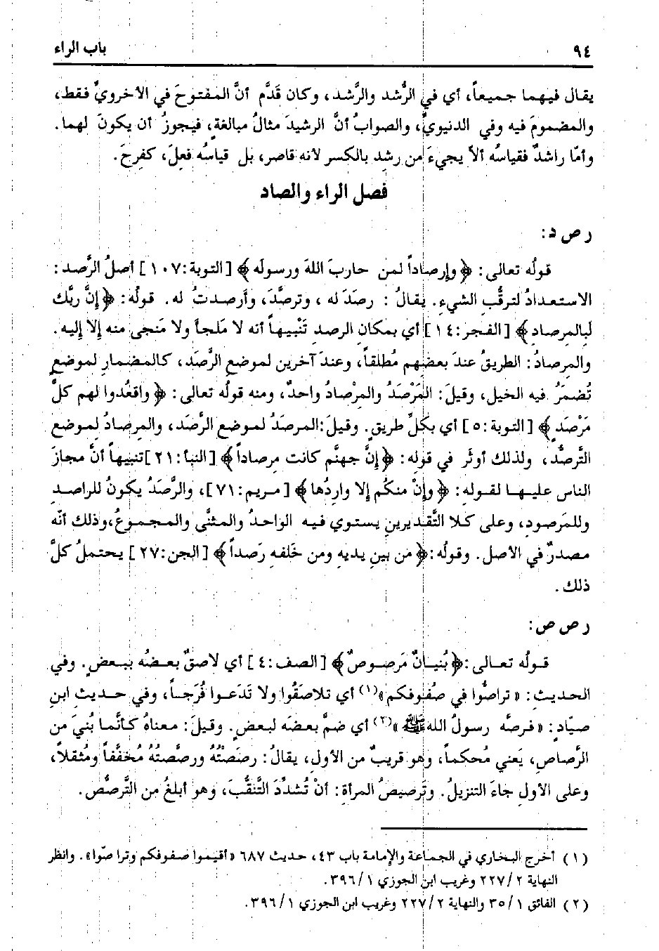 قوله تعالى:} بنيان مرصوص {[الصف: 4] أي لاصق بعضه ببعضٍ. وفي الحديث: "تراصوا في صفوفكم" أي تلاصقوا ولا تدعوا فرجًا، وفي حديث ابن صيادٍ: "فرصه رسول الله صلى الله عليه وسلم" أي ضم بعضه لبعضٍ. وقيل: معناه كأنما بني من الرصاص، يعني محكمًا، وهو قريب من الأول، يقال: رصصته ورصصته مخففًا ومثقلاً، وعلى الأول جاء التنزيل. وترصيص المرأة: أن تشدد التنقب، وهو أبلغ من الترصص.