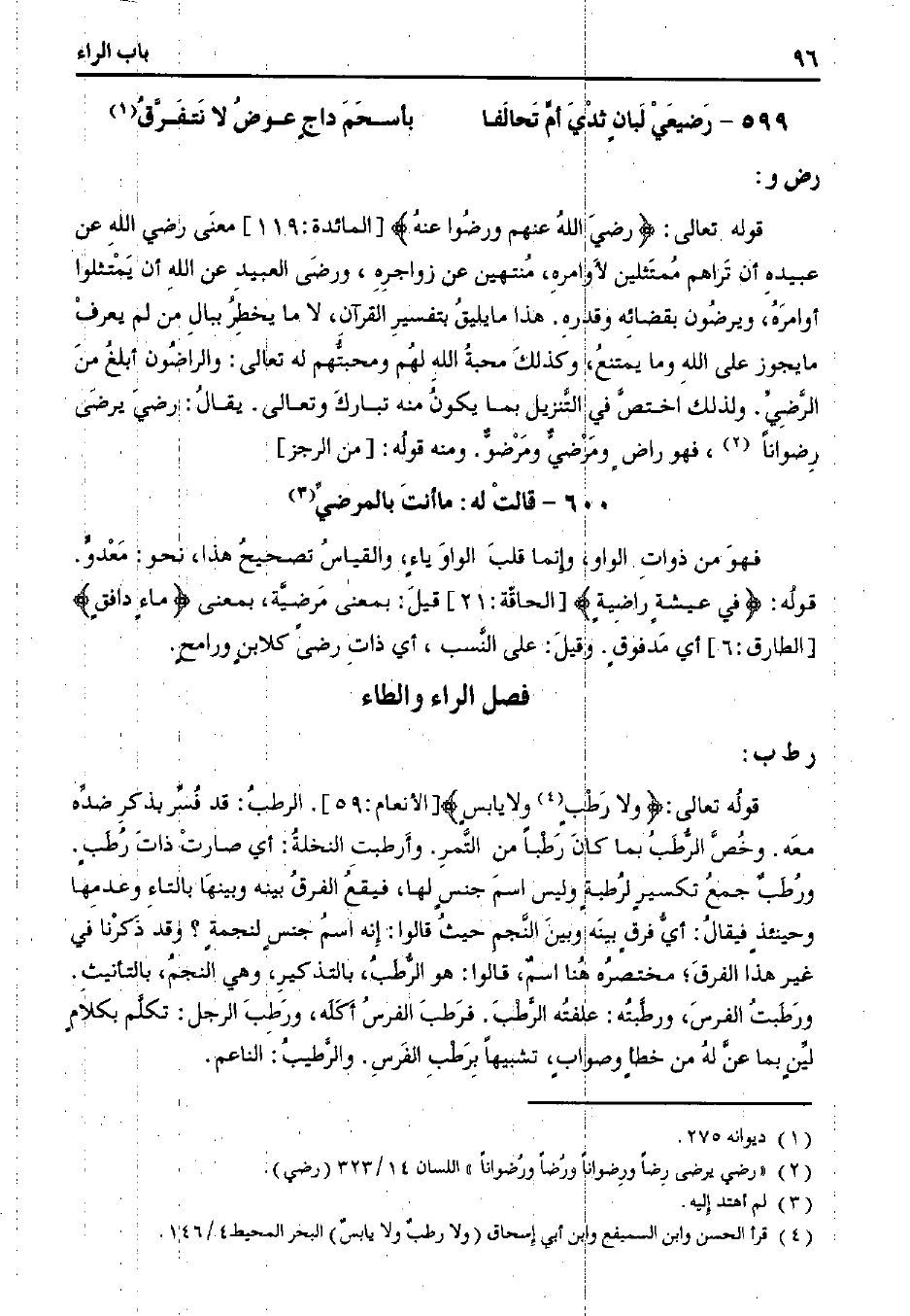 قوله تعالى:} ولا رطبٍ ولا يابسٍ {[الأنعام: 59]. الرطب: قد فسر بذكر ضده معه. وخص الرطب بما كان رطبًا من التمر. وأرطبت النخلة: أي صارت ذات رطبٍ. ورطب جمع تكسيرٍ لرطبةٍ وليس اسم جنسٍ لها، فيقع الفرق بينه وبينها بالتاء وعدمها وحينئذ فيقال: أي فرق بينه وبين النجم حيث قالوا: إنه اسم جنس لنجمة؟ وقد ذكرنا في غير هذا الفرق؛ محتصره هنا اسم، قالوا: هو الرطب، بالتذكير، وهي النجم، بالتأنيث. ورطبت الفرس، ورطبته: علفته الرطب. فرطب الفرس أكله، ورطب الرجل: تكلم بكلامٍ لينٍ بما عن له من خطأٍ وصوابٍ، تشبيها برطب الفرس. والرطيب: الناعم.
