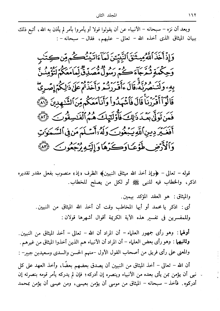وَإِذْ أَخَذَ اللَّهُ مِيثاقَ النَّبِيِّينَ لَما آتَيْتُكُمْ مِنْ كِتابٍ وَحِكْمَةٍ ثُمَّ جاءَكُمْ رَسُولٌ مُصَدِّقٌ لِما مَعَكُمْ لَتُؤْمِنُنَّ بِهِ وَلَتَنْصُرُنَّهُ قالَ أَأَقْرَرْتُمْ وَأَخَذْتُمْ عَلى ذلِكُمْ إِصْرِي قالُوا أَقْرَرْنا قالَ فَاشْهَدُوا وَأَنَا مَعَكُمْ مِنَ الشَّاهِدِينَ (81) فَمَنْ تَوَلَّى بَعْدَ ذلِكَ فَأُولئِكَ هُمُ الْفاسِقُونَ (82) أَفَغَيْرَ دِينِ اللَّهِ يَبْغُونَ وَلَهُ أَسْلَمَ مَنْ فِي السَّماواتِ وَالْأَرْضِ طَوْعاً وَكَرْهاً وَإِلَيْهِ يُرْجَعُونَ (83)