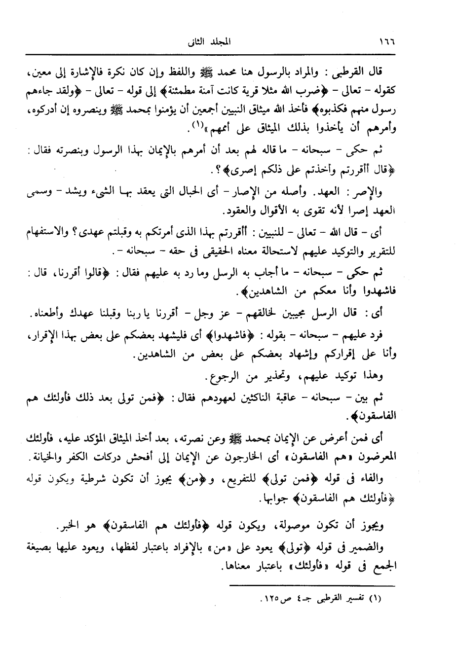 أى فمن أعرض عن الإيمان بمحمد صلّى الله عليه وسلّم وعن نصرته، بعد أخذ الميثاق المؤكد عليه، فأولئك المعرضون «هُمُ الْفاسِقُونَ» أى الخارجون عن الإيمان إلى أفحش دركات الكفر والخيانة.