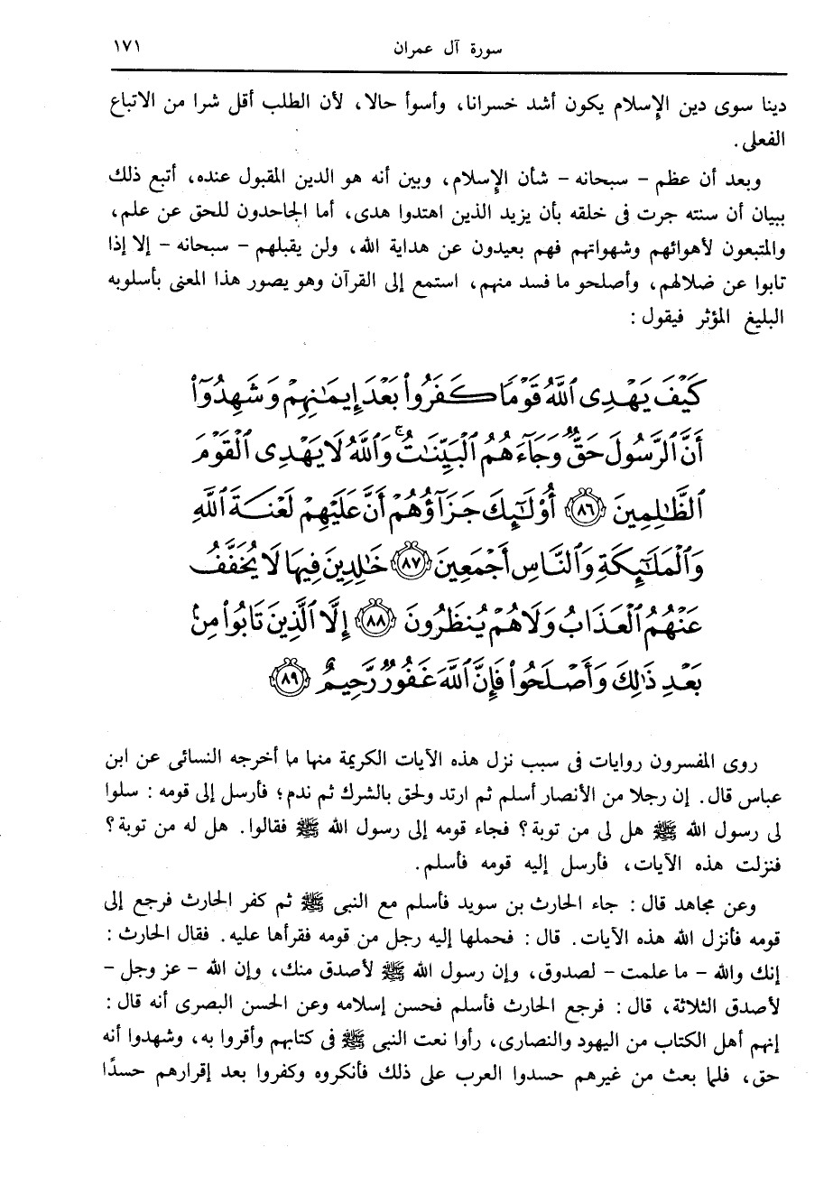كَيْفَ يَهْدِي اللَّهُ قَوْماً كَفَرُوا بَعْدَ إِيمانِهِمْ وَشَهِدُوا أَنَّ الرَّسُولَ حَقٌّ وَجاءَهُمُ الْبَيِّناتُ وَاللَّهُ لا يَهْدِي الْقَوْمَ الظَّالِمِينَ (86) أُولئِكَ جَزاؤُهُمْ أَنَّ عَلَيْهِمْ لَعْنَةَ اللَّهِ وَالْمَلائِكَةِ وَالنَّاسِ أَجْمَعِينَ (87) خالِدِينَ فِيها لا يُخَفَّفُ عَنْهُمُ الْعَذابُ وَلا هُمْ يُنْظَرُونَ (88) إِلاَّ الَّذِينَ تابُوا مِنْ بَعْدِ ذلِكَ وَأَصْلَحُوا فَإِنَّ اللَّهَ غَفُورٌ رَحِيمٌ (89)