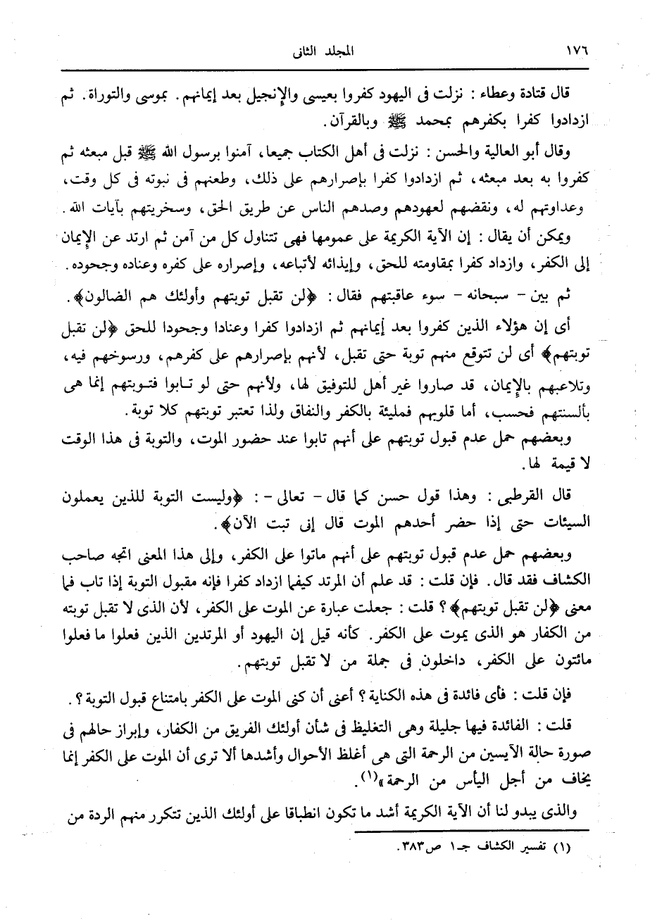 وبعضهم حمل عدم قبول توبتهم على أنهم ماتوا على الكفر، وإلى هذا المعنى اتجه صاحب الكشاف فقد قال. فإن قلت: قد علم أن المرتد كيفما ازداد كفرا فإنه مقبول التوبة إذا تاب فما معنى لَنْ تُقْبَلَ تَوْبَتُهُمْ؟ قلت: جعلت عبارة عن الموت على الكفر، لأن الذي لا تقبل توبته من الكفار هو الذي يموت على الكفر. كأنه قيل إن اليهود أو المرتدين الذين فعلوا ما فعلوا مائتون على الكفر، داخلون في جملة من لا تقبل توبتهم.