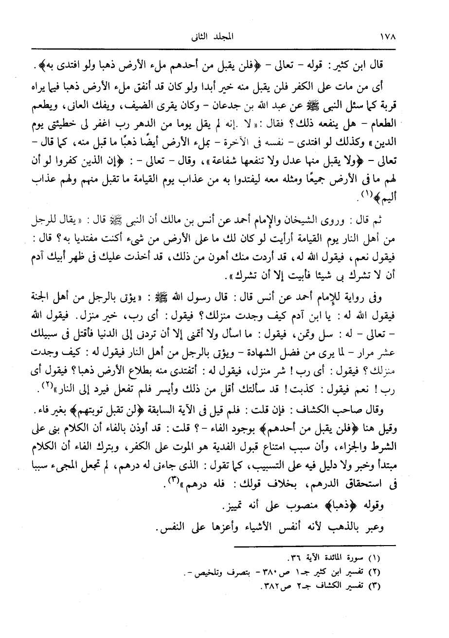 ثم قال: وروى الشيخان والإمام أحمد عن أنس بن مالك أن النبي صلّى الله عليه وسلّم قال: «يقال للرجل من أهل النار يوم القيامة أرأيت لو كان لك ما على الأرض من شيء أكنت مفتديا به؟ قال: