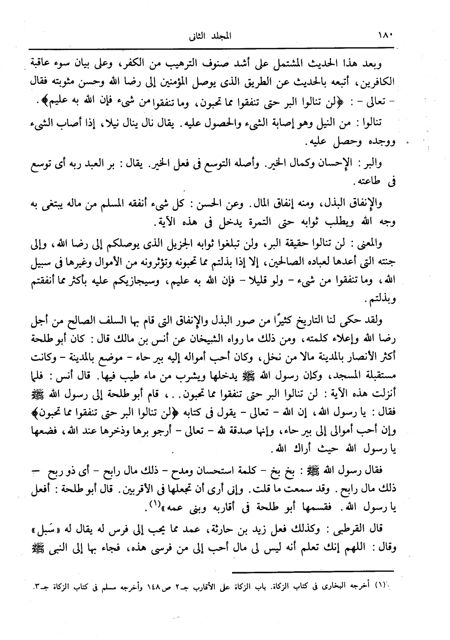 ولقد حكى لنا التاريخ كثيرا من صور البذل والإنفاق التي قام بها السلف الصالح من أجل رضا الله وإعلاء كلمته، ومن ذلك ما رواه الشيخان عن أنس بن مالك قال: كان أبو طلحة أكثر الأنصار بالمدينة مالا من نخل، وكان أحب أمواله إليه بيرحاء- موضع بالمدينة- وكانت مستقبلة المسجد، وكان رسول الله صلّى الله عليه وسلّم يدخلها ويشرب من ماء طيب فيها. قال أنس: فلما أنزلت هذه الآية: لن تنالوا البر حتى تنفقوا مما تحبون ... ، قام أبو طلحة إلى رسول الله صلّى الله عليه وسلّم فقال: يا رسول الله، إن الله- تعالى- يقول في كتابه لَنْ تَنالُوا الْبِرَّ حَتَّى تُنْفِقُوا مِمَّا تُحِبُّونَ وإن أحب أموالى إلى بيرحاء، وإنها صدقة الله- تعالى- أرجو برها وذخرها عند الله، فضعها يا رسول الله حيث أراك الله.
