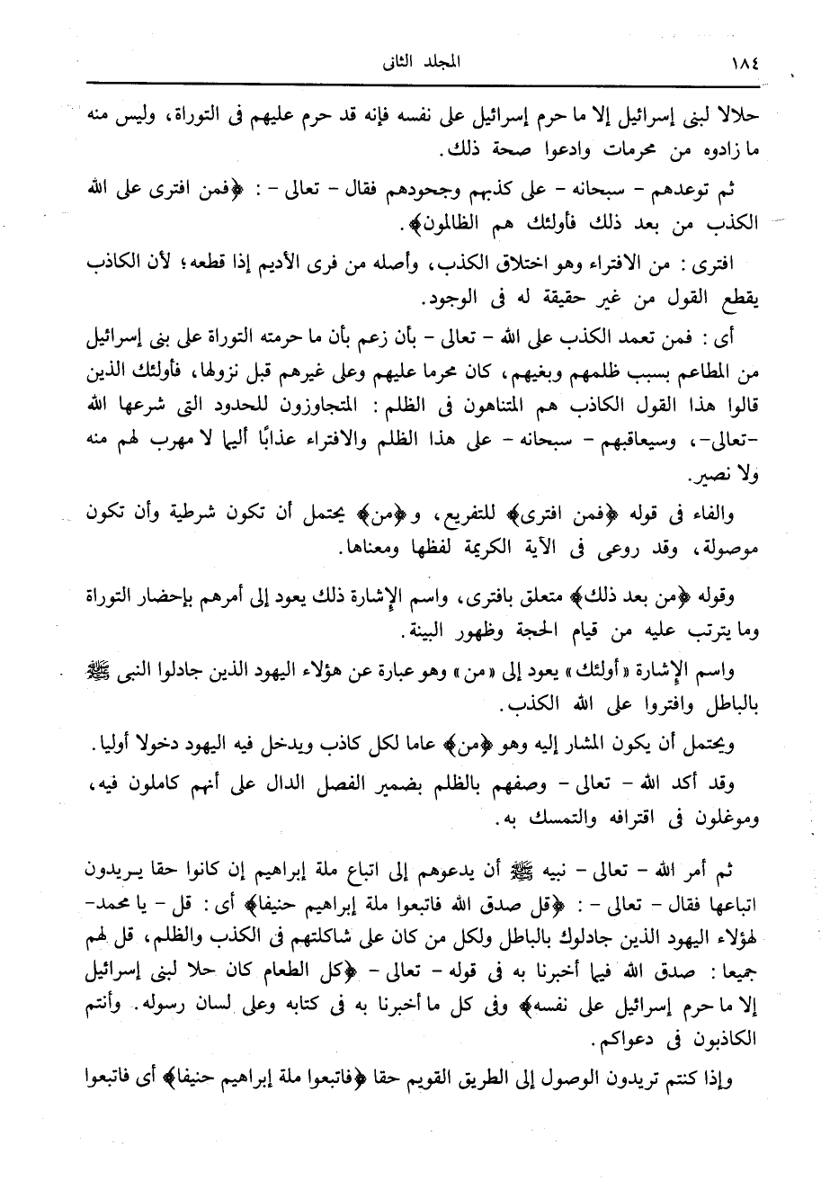 ثم توعدهم- سبحانه- على كذبهم وجحودهم فقال- تعالى-: فَمَنِ افْتَرى عَلَى اللَّهِ الْكَذِبَ مِنْ بَعْدِ ذلِكَ فَأُولئِكَ هُمُ الظَّالِمُونَ.