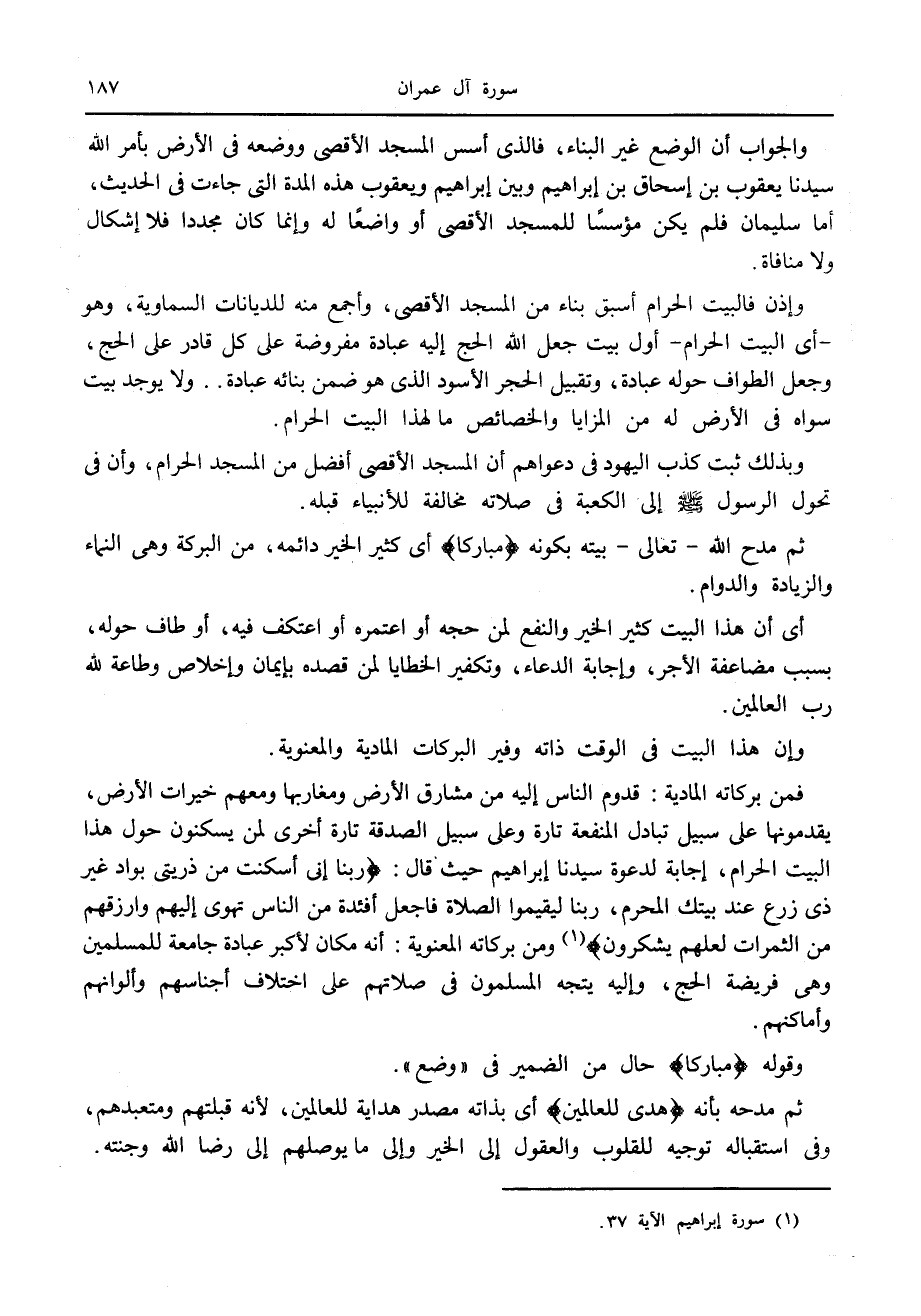 وإذن فالبيت الحرام أسبق بناء من المسجد الأقصى، وأجمع منه للديانات السماوية، وهو- أى البيت الحرام- أول بيت جعل الله الحج إليه عبادة مفروضة على كل قادر على الحج، وجعل الطواف حوله عبادة، وتقبيل الحجر الأسود الذي هو ضمن بنائه عبادة.. ولا يوجد بيت سواه في الأرض له من المزايا والخصائص ما لهذا البيت الحرام.