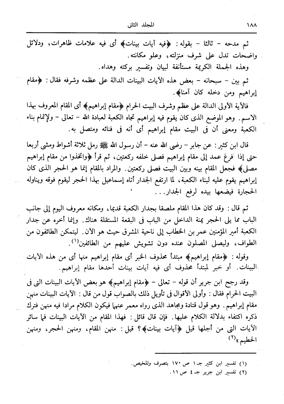 وقد رجح ابن جرير أن قوله- تعالى- مَقامُ إِبْراهِيمَ هو بعض الآيات البينات التي في البيت الحرام فقال: وأولى الأقوال في تأويل ذلك بالصواب قول من قال: الآيات البينات منهن مقام إبراهيم. وهو قول قتادة ومجاهد الذي رواه معمر عنهما فيكون الكلام مرادا فيه منهن فترك ذكره اكتفاء بدلالة الكلام عليها. فإن قال قائل: فهذا المقام من الآيات البينات فما سائر الآيات التي من أجلها قيل آياتٌ بَيِّناتٌ؟ قيل: منهن المقام، ومنهن الحجر، ومنهن الحطيم» «2» .