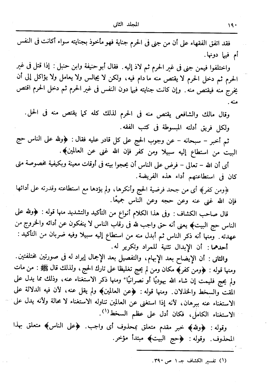 ومنها قوله: وَمَنْ كَفَرَ مكان ومن لم يحج تغليظا على تارك الحج، ولذلك قال صلّى الله عليه وسلّم: من مات ولم يحج فليمت إن شاء الله يهوديا أو نصرانيا ومنها ذكر الاستغناء عنه، وذلك مما يدل على المقت والسخط والخذلان. ومنها قوله: عَنِ الْعالَمِينَ ولم يقل عنه، لأن فيه الدلالة على الاستغناء عنه ببرهان، لأنه إذا استغنى عن العالمين تناوله الاستغناء لا محالة ولأنه يدل على الاستغناء الكامل، فكان أدل على عظم السخط «1» .