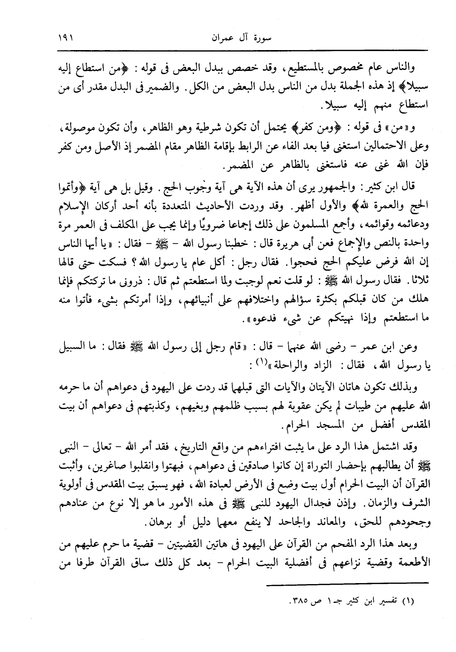 قال ابن كثير: والجمهور يرى أن هذه الآية هي آية وجوب الحج. وقيل بل هي آية وَأَتِمُّوا الْحَجَّ وَالْعُمْرَةَ لِلَّهِ والأول أظهر. وقد وردت الأحاديث المتعددة بأنه أحد أركان الإسلام ودعائمه وقوائمه، وأجمع المسلمون على ذلك إجماعا ضروريا وإنما يجب على المكلف في العمر مرة واحدة بالنص والإجماع فعن أبى هريرة قال: خطبنا رسول الله- صلّى الله عليه وسلّم- فقال: «يا أيها الناس إن الله فرض عليكم الحج فحجوا. فقال رجل: أكل عام يا رسول الله؟ فسكت حتى قالها ثلاثا. فقال رسول الله صلّى الله عليه وسلّم: لو قلت نعم لوجبت ولما استطعتم ثم قال: ذروني ما تركتكم فإنما هلك من كان قبلكم بكثرة سؤالهم واختلافهم على أنبيائهم، وإذا أمرتكم بشيء فأتوا منه ما استطعتم وإذا نهيتكم عن شيء فدعوه» .