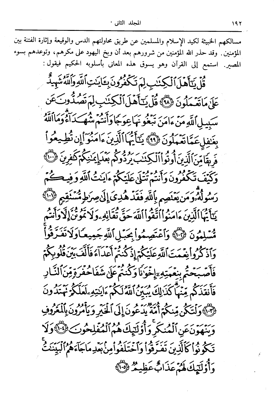 قُلْ يا أَهْلَ الْكِتابِ لِمَ تَكْفُرُونَ بِآياتِ اللَّهِ وَاللَّهُ شَهِيدٌ عَلى ما تَعْمَلُونَ (98) قُلْ يا أَهْلَ الْكِتابِ لِمَ تَصُدُّونَ عَنْ سَبِيلِ اللَّهِ مَنْ آمَنَ تَبْغُونَها عِوَجاً وَأَنْتُمْ شُهَداءُ وَمَا اللَّهُ بِغافِلٍ عَمَّا تَعْمَلُونَ (99) يا أَيُّهَا الَّذِينَ آمَنُوا إِنْ تُطِيعُوا فَرِيقاً مِنَ الَّذِينَ أُوتُوا الْكِتابَ يَرُدُّوكُمْ بَعْدَ إِيمانِكُمْ كافِرِينَ (100) وَكَيْفَ تَكْفُرُونَ وَأَنْتُمْ تُتْلى عَلَيْكُمْ آياتُ اللَّهِ وَفِيكُمْ رَسُولُهُ وَمَنْ يَعْتَصِمْ بِاللَّهِ فَقَدْ هُدِيَ إِلى صِراطٍ مُسْتَقِيمٍ (101) يا أَيُّهَا الَّذِينَ آمَنُوا اتَّقُوا اللَّهَ حَقَّ تُقاتِهِ وَلا تَمُوتُنَّ إِلاَّ وَأَنْتُمْ مُسْلِمُونَ (102)