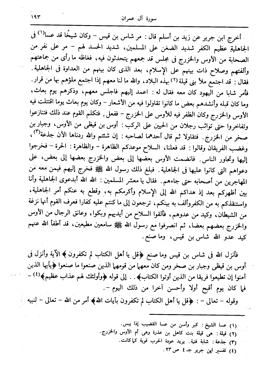 فأنزل الله في شاس بن قيس وما صنع قُلْ يا أَهْلَ الْكِتابِ لِمَ تَكْفُرُونَ الآية وأنزل في أوس بن قيظى وجبار بن صخر ومن كان معهما من قومهما الذين صنعوا ما صنعوا يا أَيُّهَا الَّذِينَ آمَنُوا إِنْ تُطِيعُوا فَرِيقاً مِنَ الَّذِينَ أُوتُوا الْكِتابَ.. إلى قوله وَأُولئِكَ لَهُمْ عَذابٌ عَظِيمٌ «4» - فما كان يوم أقبح أولا وأحسن آخرا من ذلك اليوم-.
