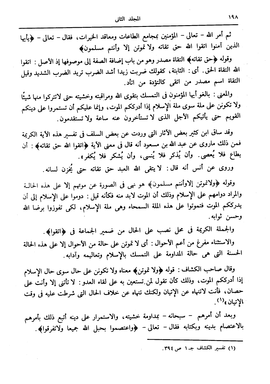 والمعنى: بالغو أيها المؤمنون في التمسك بتقوى الله ومراقبته وخشيته حتى لا تتركوا منها شيئا ولا تكونن على ملة سوى ملة الإسلام إذا أدرككم الموت، وإنما عليكم أن تستمروا على دينكم القويم حتى يأتيكم الأجل الذي لا تستأخرون عنه ساعة ولا تستقدمون.